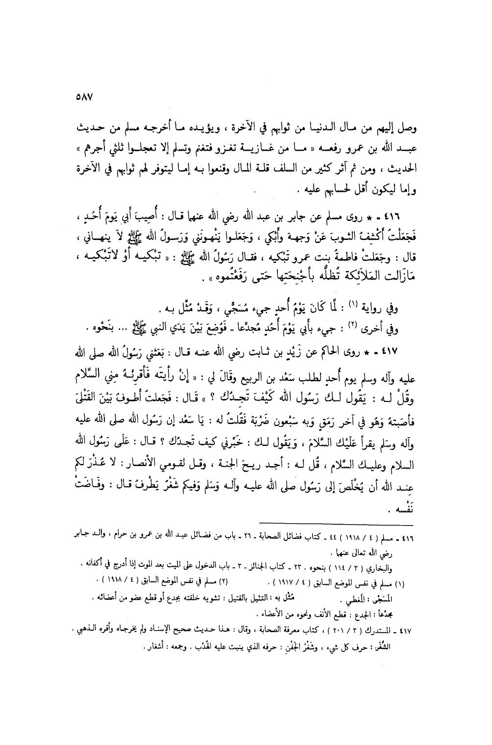 416 - * روى مسلم عن جابر بن عبد الله رضي الله عنهما قال: أصيب أبي يوم أحد، فجعلت أكشف الثوب عن وجهه وأبكي، وجعلوا ينهونني ورسول الله صلى الله عليه وسلم لا ينهاني، قال: وجعلت فاطمة بنت عمرو تبكيه، فقال رسول الله صلى الله عليه وسلم: "تبكيه أو لا تبكيه، ما زالت الملائكة تظله بأجنحتها حتى رفعتموه".