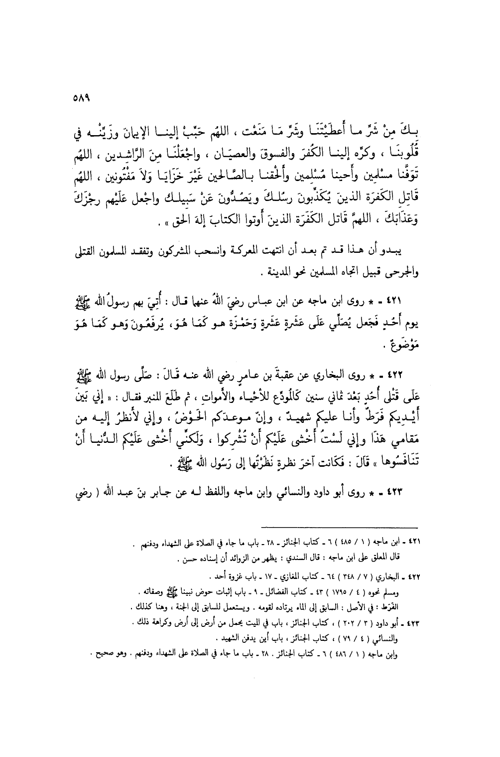 421 - ابن ماجه (1/ 485) 6 - كتاب الجنائز - 28 - باب ما جاء في الصلاة على الشهداء ودفنهم.