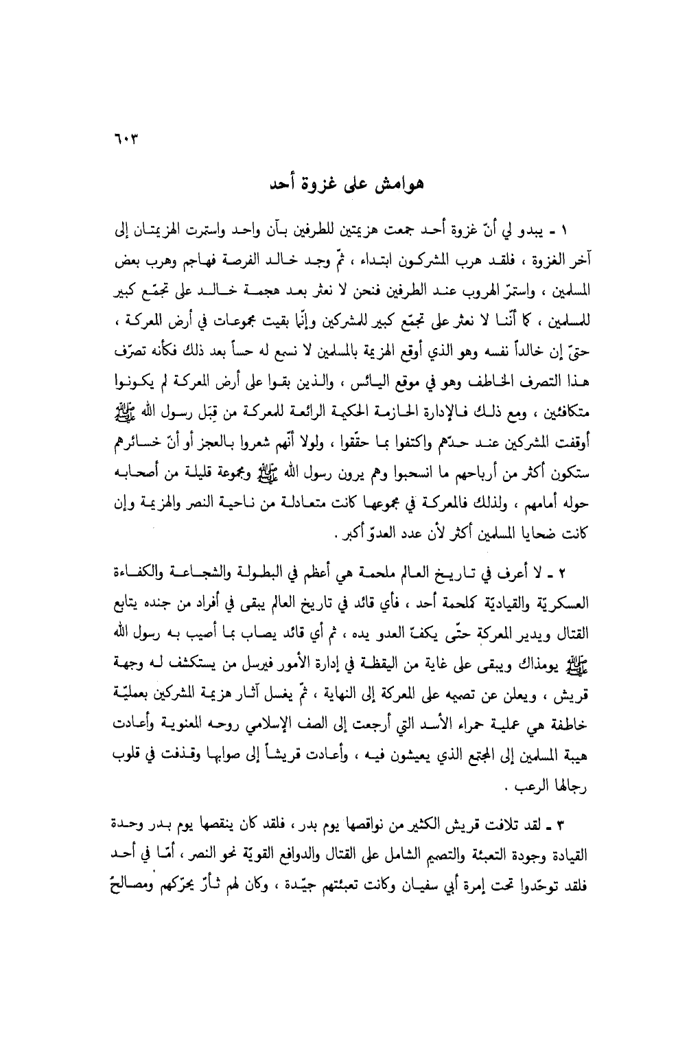 1 - يبدو لي أن غزوة أحد جمعت هزيمتين للطرفين بآن واحد واستمرت الهزيمتان إلى آخر الغزوة، فلقد هرب المشركون ابتداء، ثم وجد خالد الفرصة فهاجم وهرب بعض المسلمين، واستمر الهروب عند الطرفين فنحن لا نعثر بعد هجمة خالد على تجمع كبير للمسلمين، كما أننا لا نعثر على تجمع كبير للمشركين وإنما بقيت مجموعات في أرض المعركة، حتى إن خالداً نفسه وهو الذي أوقع الهزيمة بالمسلمين لا نسمع له حساً بعد ذلك فكأنه تصرف هذا التصرف الخاطف وهو في موقع اليائس، والذين بقوا على أرض المعركة لم يكونوا متكافئين، ومع ذلك فالإدارة الحازمة الحكيمة الرائعة للمعركة من قبل رسول الله صلى الله عليه وسلم أوقفت المشركين عند حدهم واكتفوا بما حققوا، ولولا أنهم شعروا بالعجز أو أن خسائرهم ستكون أكثر من أرباحهم ما انسحبوا وهم يرون رسول الله صلى الله عليه وسلم ومجموعة قليلة من أصحابه حوله أمامهم، ولذلك فالمعركة في مجموعها كانت متعادلة من ناحية النصر والهزيمة وإن كانت ضحايا المسلمين أكثر لأن عدد العدو أكبر.
