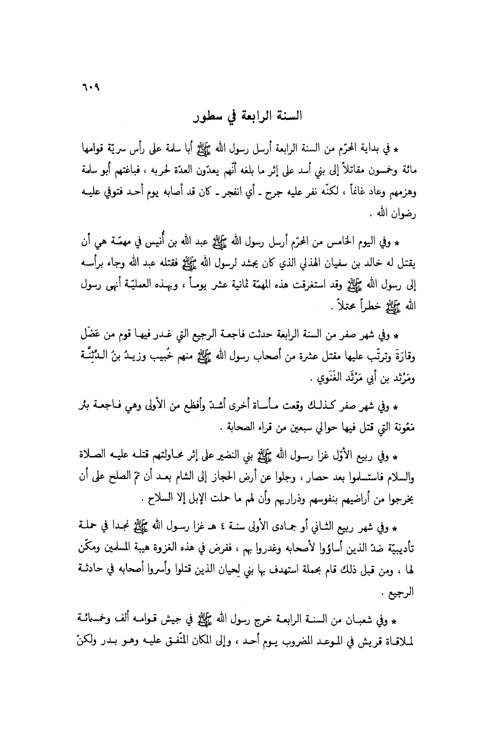 * في بداية المحرم من السنة الرابعة أرسل رسول الله صلى الله عليه وسلم أبا سلمة على رأس سرية قوامها مائة وخمسون مقاتلاً إلى بني أسد على إثر ما بلغه أنهم يعدون العدة لحربه، فباغتهم أبو سلمة وهزمهم وعاد غانماً، لكنه نفر عليه جرح - أي انفجر - كان قد اصابه يوم أحد فتوفي عليه رضوان الله.