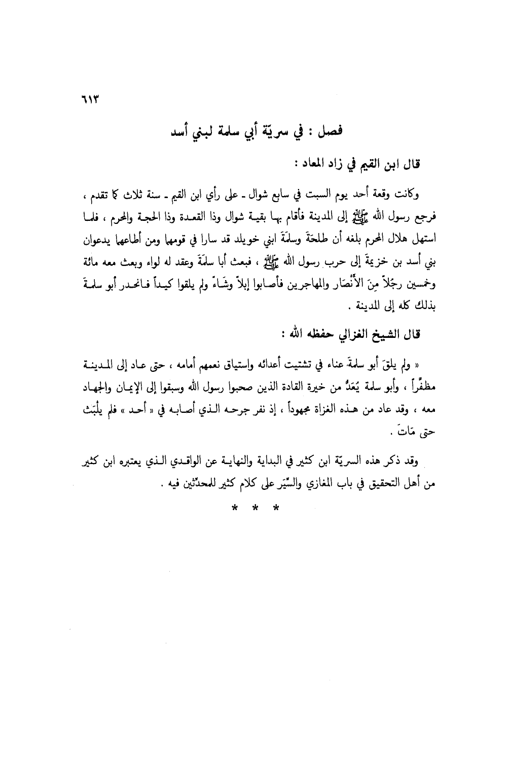 "ولم يلق أبو سلمة عناء في تشتيت أعدائه واستياق نعمهم أمامه، حتى عاد إلى المدينة مظفراً، وأبو سلمة يعد من خيرة القادة الذين صحبوا رسول الله وسبقوا إلى الإيمان والجهاد معه، وقد عاد من هذه الغزاة مجهوداً، إذ نفر جرحه الذي أصابه في "أحد" فلم يلبث حتى مات.