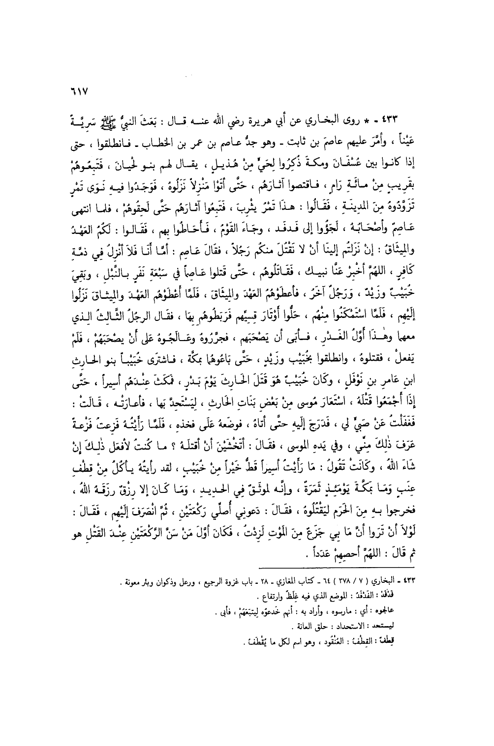 433 - * روى البخاري عن أبي هريرة رضي الله عنه قال: بعث النبي صلى الله عليه وسلم سرية عيناً، وأمر عليهم عاصم بن ثابت - وهو جد عاصم بن عمر بن الخطاب - فانطلقوا، حتى إذا كانوا بين عسفان ومكة ذكروا لحي من هذيل، يقال لهم بنو لحيان، فتبعوهم بقريب من مائة رام، فاقتصوا آثارهم، حتى أتوا منزلاً نزلوه، فوجدوا فيه نوى تمر تزودوه من المدينة، فقالوا: هذا تمر يثرب، فتبعوا آثارهم حتى لحقوهم، فلما انتهى عاصم وأصحابه، لجؤوا إلى فدفد، وجاء القوم، فأحاطوا بهم، فقالوا: لكم العهد والميثاق: إن نزلتم إلينا أن لا نقتل منكم رجلاً، فقال عاصم: أما أنا فلا أنزل في ذمة كافر، اللهم أخبر عنا نبيك، فقاتلوهم، حتى قتلوا عاصماً في سبعة نفر بالنبل، وبقي خبيب وزيد، ورجل آخر، فأعطوهم العهد والميثاق، فلما أعطوهم العهد والميثاق نزلوا إليهم، فلما استمكنوا منهم، حلوا أوتار قسيهم فربطوهم بها، فقال الرجل الثالث الذي معهما وهذا أول الغدر، فأبى أن يصحبهم، فجرروه وعالجوه على أن يصحبهم، فلم يفعل، فقتلوه، وانطلقوا بخبيب وزيد، حتى باعوهما بمكة، فاشترى خبيباً بنو الحارث ابن عامر بن نوفل، وكان خبيب هو قتل الحارث يوم بدر، فمكث عندهم أسيراً، حتى إذا أجمعوا قتله، استعار موسى من بعض بنات الحارث، ليستحد بها، فأعارته، قالت: فغفلت عن صبي لي، فدرج إليه حتى أتاه، فوضعه على فخذه، فلما رأيته فزعت فزعة عرف ذلك مني، وفي يده الموسى، فقال: أتخشين أن أقتله؟ ما كنت لأفعل ذلك إن شاء الله، وكانت تقول: ما رأيت أسيراً قط خيراً من خبيب، لقد رأيته يأكل من قطف عنب وما بمكة يومئذ ثمرة، وإنه لموثق في الحديد، وما كان إلا رزق رزقه الله، فخرجوا به من الحرم ليقتلوه، فقال: دعوني أصلي ركعتين، ثم انصرف إليهم، فقال: لولا أن تروا أن ما بي جزع من الموت لزدت، فكان أول من سن الركعتين عند القتل هو ثم قال: اللهم أحصهم عدداً.