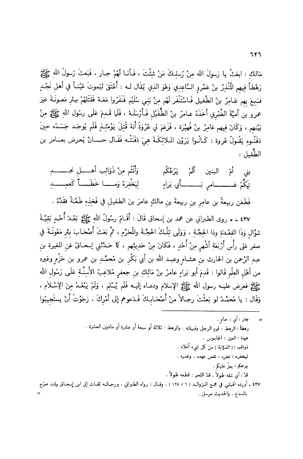 437 - * روى الطبراني عن محمد بن إسحاق قال: أقام رسول الله صلى الله عليه وسلم بعد أحد بقية شوال وذا القعدة وذا الحجة، وولى تلك الحجة والمحرم، ثم بعث أصحاب بئر معونة في صفر على رأس أربعة أشهر من أحد، فكان من حديثهم، كما حدثني إسحاق عن المغيرة بن عبد الرحمن بن الحارث بن هشام وعبد الله بن أبي بكر بن محمد بن عمرو بن حزم وغيره من أهل العلم قالوا: قدم أبو براء عامر بن مالك بن جعفر ملاعب الأسنة على رسول الله صلى الله عليه وسلم فعرض عليه رسول الله صلى الله عليه وسلم الإسلام ودعاه إليه فلم يسلم، ولم يبعد من الإسلام، وقال: يا محمد لو بعثت رجالاً من أصحابك فدعوهم إلى أمرك، رجوت أن يستجيبوا