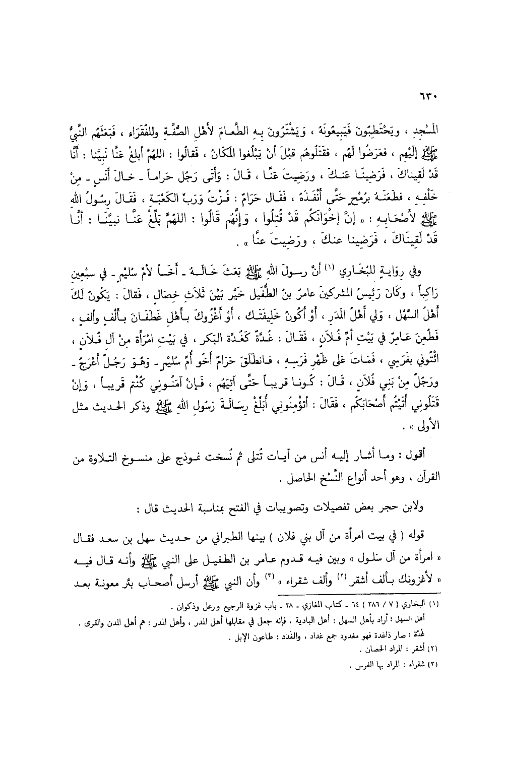 المسجد، ويحتطبون فيبيعونه، ويشترون به الطعام لأهل الصفة وللفقراء، فبعثهم النبي صلى الله عليه وسلم إليهم، فعرضوا لهم، فقتلوهم قبل أن يبلغوا المكان، فقالوا: اللهم أبلغ عنا نبينا: أنا قد لقيناك، فرضينا عنك، ورضيت عنا، قال: وأتى رجل حراماً - خال أنس - من خلفه، فطعنه برمح حتى أنفذه، فقال حرام: فزت ورب الكعبة، فقال رسول الله صلى الله عليه وسلم لأصحابه: "إن إخوانكم قد قتلوا، وإنهم قالوا: اللهم بلغ عنا نبينا: أنا قد لقيناك، فرضينا عنك، ورضيت عنا".