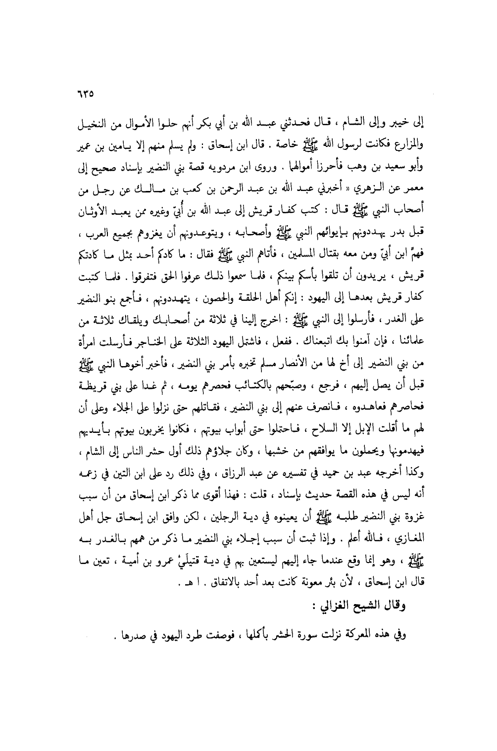 إلى خيبر وإلى الشام، قال فحدثني عبد الله بن أبي بكر أنهم حلوا الأموال من النخيل والمزارع فكانت لرسول الله صلى الله عليه وسلم خاصة. قال ابن إسحاق: ولم يسلم منهم إلا يامين بن عمير وأبو سعيد بن وهب فأحرزا أموالهما. وروى ابن مردويه قصة بني النضير بإسناد صحيح إلى معمر عن الزهري "أخبرني عبد الله بن عبد الرحمن بن كعب بن مالك عن رجل من أصحاب النبي صلى الله عليه وسلم قال: كتب كفار قريش إلى عبد الله بن أبي وغيره ممن يعبد الأوثان قبل بدر يهددونهم بإيوائهم النبي صلى الله عليه وسلم وأصحابه، ويتوعدونهم أن يغزوهم بجميع العرب، فهم ابن أبي ومن معه بقتال المسلمين، فأتاهم النبي صلى الله عليه وسلم فقال: ما كادكم أحد بمثل ما كادتكم قريش، يريدون أن تلقوا بأسكم بينكم، فلما سمعوا ذلك عرفوا الحق فتفرقوا. فلما كتبت كفار قريش بعدها إلى اليهود: إنكم أهل الحلقة والحصون، يتهددونهم، فأجمع بنو النضير على الغدر، فأرسلوا إلى النبي صلى الله عليه وسلم: اخرج إلينا في ثلاثة من أصحابك ويلقاك ثلاثة من علمائنا، فإن آمنوا بك اتبعناك. ففعل، فاشتمل اليهود الثلاثة على الخناجر فأرسلت امرأة من بني النضير إلى أخ لها من الأنصار مسلم تخبره بأمر بني النضير، فأخبر أخوها النبي صلى الله عليه وسلم قبل أن يصل إليهم، فرجع، وصبحهم بالكتائب فحصرهم يومه، ثم غدا على بني قريظة فحاصرهم فعاهدوه، فانصرف عنهم إلى بني النضير، فقاتلهم حتى نزلوا على الجلاء وعلى أن لهم ما أقلت الإبل إلا السلاح، فاحتملوا حتى أبواب بيوتهم، فكانوا يخربون بيوتهم بأيديهم فيهدمونها ويحملون ما يوافقهم من خشبها، وكان جلاؤهم ذلك أول حشر الناس إلى الشام، وكذا أخرجه عبد بن حميد في تفسيره عن عبد الرزاق، وفي ذلك رد على ابن التين في زعمه أنه ليس في هذه القصة حديث بإسناد، قلت: فهذا أقوى مما ذكر ابن إسحاق من أن سبب غزوة بني النضير طلبه صلى الله عليه وسلم أن يعينوه في دية الرجلين، لكن وافق ابن إسحاق جل أهل المغازي، فالله أعلم. وإذا ثبت أن سبب إجلاء بني النضير ما ذكر من همهم بالغدر به صلى الله عليه وسلم، وهو إنما وقع عندما جاء إليهم ليستعين بهم في دية قتيلي عمرو بن أمية، تعين ما قال ابن إسحاق، لأن بئر معونة كانت بعد أحد بالاتفاق. اهـ.