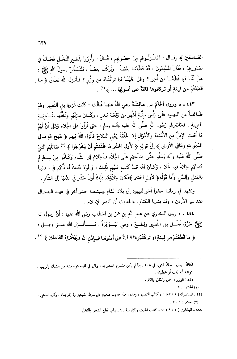444 - * روى البخاري عن عبد الله بن عمر بن الخطاب رضي الله عنهما: أن رسول الله صلى الله عليه وسلم حرق نخل بني النضير وقطع، وهي البويرة، فأنزل الله عز وجل: