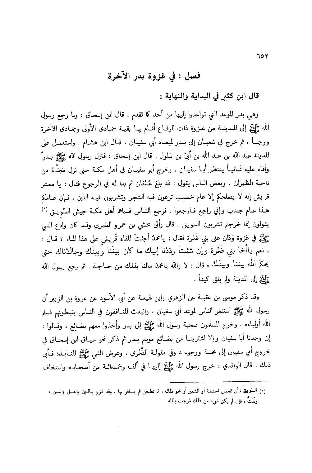 وهي بدر الموعد التي تواعدوا إليها من أحد كما تقدم. قال ابن إسحاق: ولما رجع رسول الله صلى الله عليه وسلم إلى المدينة من غزوة ذات الرقاع أقام بها بقية جمادى الأولى وجمادى الآخرة ورجباً، ثم خرج في شعبان إلى بدر لميعاد أبي سفيان. قال ابن هشام: واستعمل على المدينة عبد الله بن عبد الله بن أبي بن سلول. قال ابن إسحاق: فنزل رسول الله صلى الله عليه وسلم بدراً وأقام عليه ثمانياً ينتظر أبا سفيان. وخرج أبو سفيان في أهل مكة حتى نزل مجنة من ناحية الظهران. وبعض الناس يقول: قد بلغ عسفان ثم بدا له في الرجوع فقال: يا معشر قريش إنه لا يصلحكم إلا عام خصيب ترعون فيه الشجر وتشربون فيه اللبن. فإن عامكم هذا عام جدب وإني راجع فارجعوا. فرجع الناس فسماهم أهل مكة جيش السويق (1) يقولون إنما خرجتم تشربون السويق. قال وأتى مخشي بن عمرو الضمري وقد كان وادع النبي صلى الله عليه وسلم في غزوة ودان على بني ضمرة فقال: يا محمد أجئت للقاء قريش على هذا الماء؟ قال: "نعم يا أخا بني ضمرة وإن شئت رددنا إليك ما كان بيننا وبينك وجالدناك حتى يحكم الله بيننا وبينك" قال: لا والله يا محمد ما لنا بذلك من حاجة. ثم رجع رسول الله صلى الله عليه وسلم إلى المدينة ولم يلق كيداً.