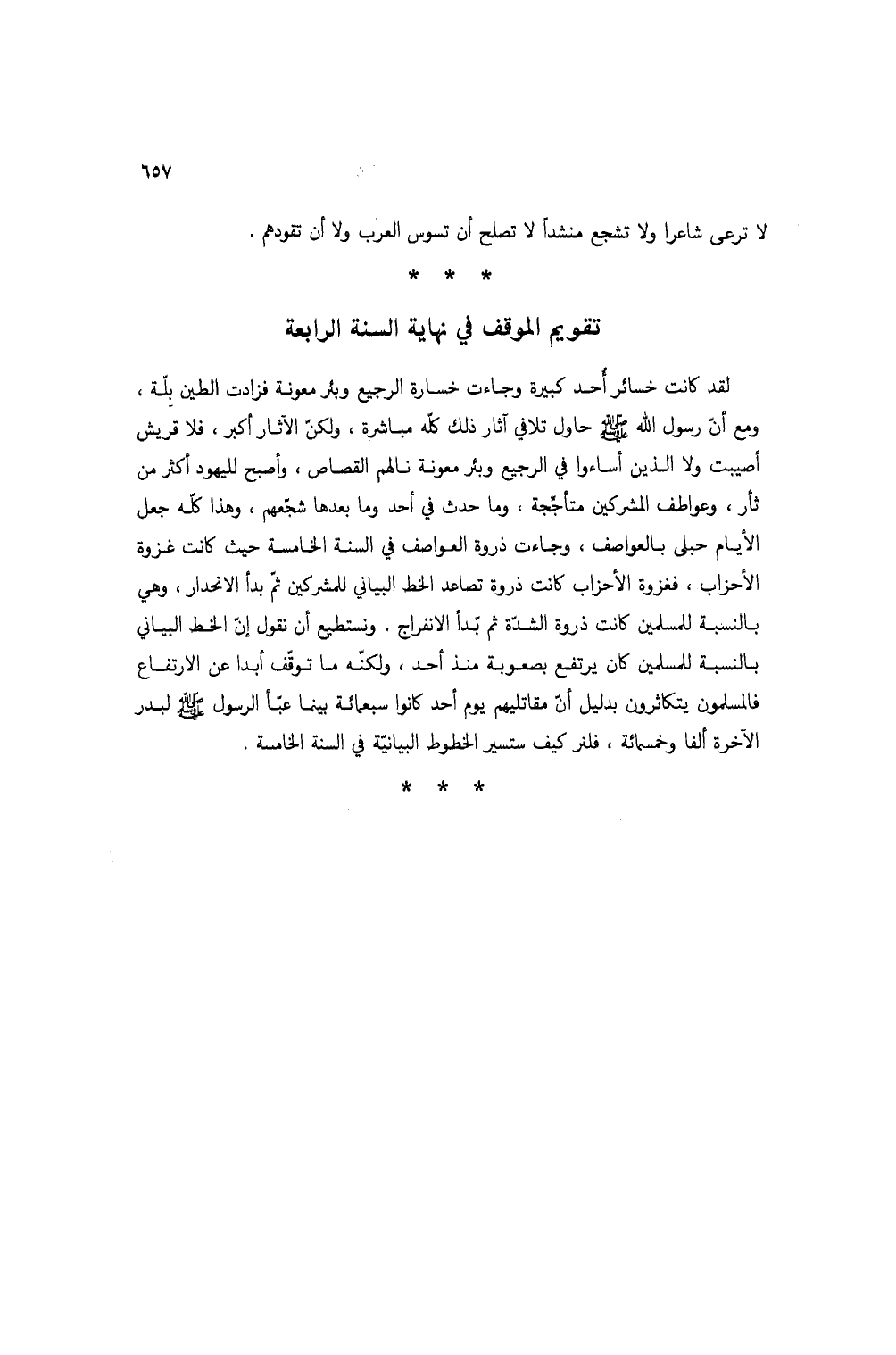 لقد كانت خسائر أحد كبيرة وجاءت خسارة الرجيع وبئر معونة فزادت الطين بلة، ومع أن رسول الله صلى الله عليه وسلم حاول تلافي آثار ذلك كله مباشرة، ولكن الآثار أكبر، فلا قريش أصيبت ولا الذين أساءوا في الرجيع وبئر معونة نالهم القصاص، وأصبح لليهود أكثر من ثأر، وعواطف المشركين متأججة، وما حدث في أحد وما بعدها شجعهم، وهذا كله جعل الأيام حبلى بالعواصف، وجاءت ذروة العواصف في السنة الخامسة حيث كانت غزوة الأحزاب، فغزوة الأحزاب كانت ذروة تصاعد الخط البياني للمشركين ثم بدأ الانحدار، وهي بالنسبة للمسلمين كانت ذروة الشدة ثم بدأ الانفراج. ونستطيع أن نقول إن الخط البياني بالنسبة للمسلمين كان يرتفع بصعوبة منذ أحد، ولكنه ما توقف أبداً عن الارتفاع فالمسلمون يتكاثرون بدليل أن مقاتليهم يوم أحد كانوا سبعمائة بينما عبأ الرسول صلى الله عليه وسلم لبدر الآخرة ألفا وخمسمائة، فلنر كيف ستسير الخطوط البيانية في السنة الخامسة.