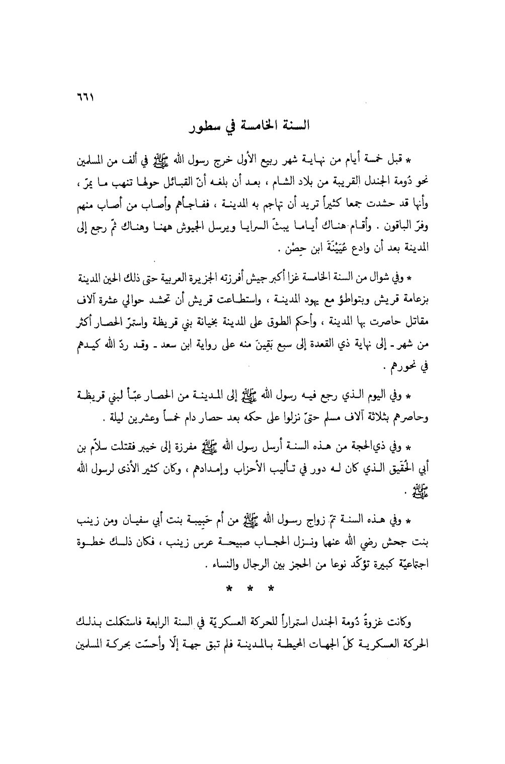* قبل خمسة أيام من نهاية شهر ربيع الأول خرج رسول الله صلى الله عليه وسلم في ألف من المسلمين نحو دومة الجندل القريبة من بلاد الشام، بعد أن بلغه أن القبائل حولها تنهب ما يمر، وأنها قد حشدت جمعاً كثيراً تريد أن تهاجم به المدينة، ففاجأهم وأصاب من أصاب منهم وفر الباقون. وأقام هناك أياماً يبث السرايا ويرسل الجيوش ههنا وهناك ثم رجع إلى المدينة بعد أن وادع عيينة ابن حصن.