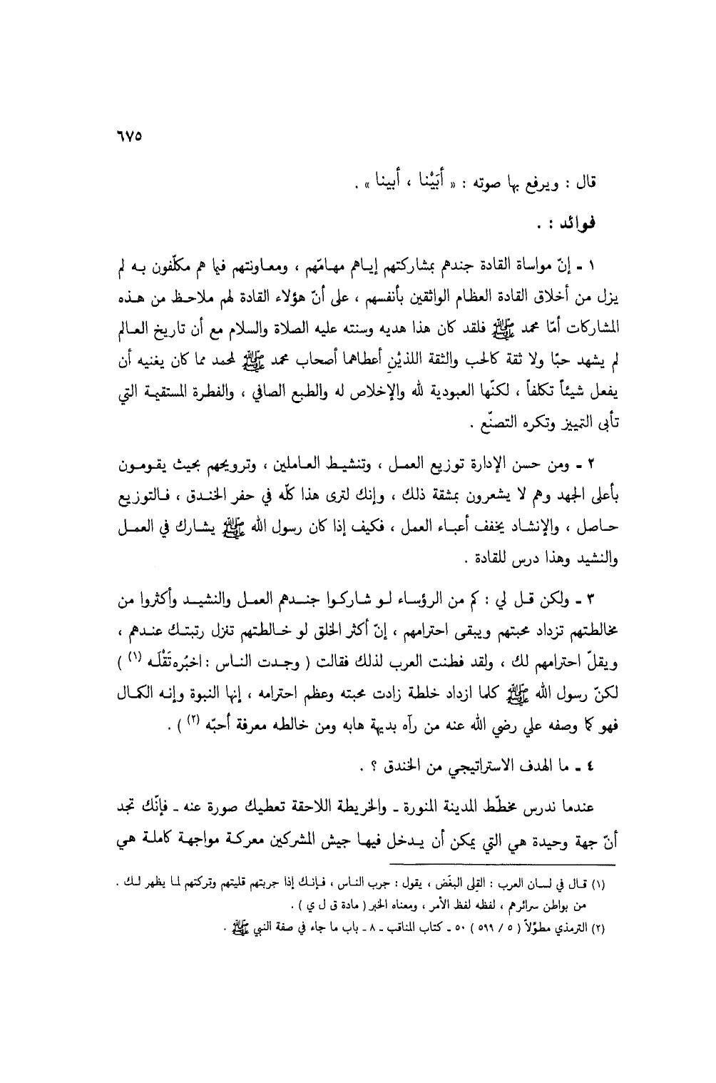 3 - ولكن قل لي: كم من الرؤساء لو شاركوا جندهم العمل والنشيد وأكثروا من مخالطتهم تزداد محبتهم ويبقى احترامهم، إن أكثر الخلق لو خالطتهم تنزل رتبتك عندهم، ويقل احترامهم لك، ولقد فطنت العرب لذلك فقالت (وجدت الناس: اخبره تقله (1)) لكن رسول الله صلى الله عليه وسلم كلما ازداد خلطة زادت محبته وعظم احترامه، إنها النبوة وإنه الكمال فهو كما وصفه علي رضي الله عنه من رآه بديهة هابه ومن خالطه معرفة أحبه (2)).