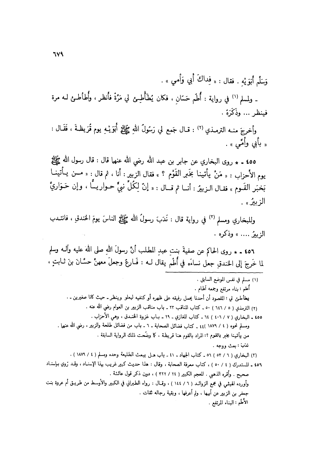 455 - * روى البخاري عن جابر بن عبد الله رضي الله عنهما قال: قال رسول الله صلى الله عليه وسلم يوم الأحزاب: "من يأتينا بخبر القوم؟ " فقال الزبير: أنا، ثم قال: "من يأتينا بخبر القوم" فقال الزبير: أنا ثم قال: "إن لكل نبي حوارياً، وإن حواري الزبير".