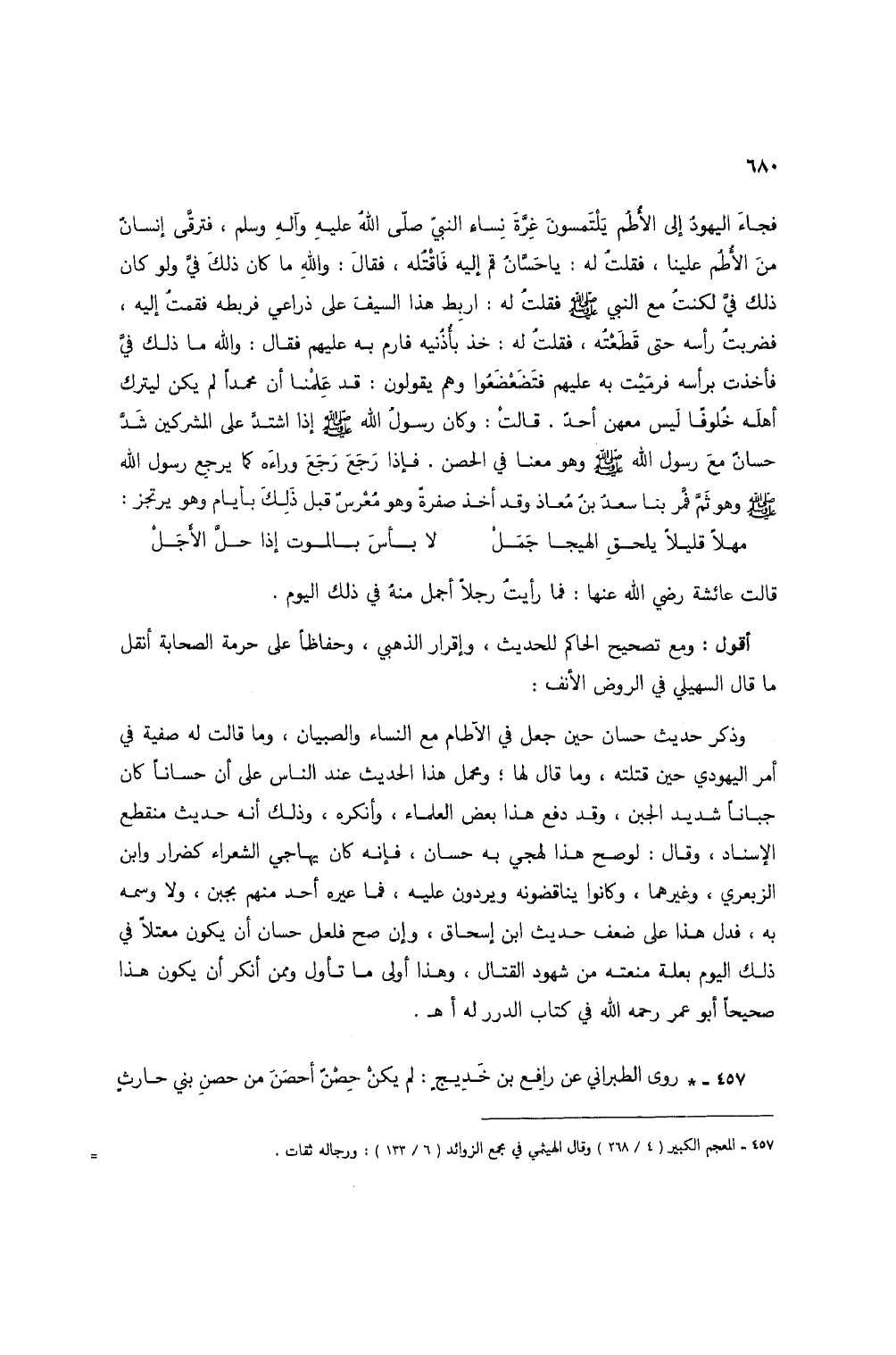 فجاء اليهود إلى الأطم يلتمسون غرة نساء النبي صلى الله عليه وآله وسلم، فترقى إنسان من الأطم علينا، فقلت له: يا حسان قم إليه فاقتله، فقال: والله ما كان ذلك في ولو كان ذلك في لكنت مع النبي صلى الله عليه وسلم فقلت له: اربط هذا السيف على ذراعي فربطه فقمت إليه، فضربت رأسه حتى قطعته، فقلت له: خذ بأذنيه فارم به عليهم فقال: والله ما ذلك في فأخذت برأسه فرميت به عليهم فتضعضعوا وهم يقولون: قد علمنا أن محمداً لم يكن ليترك أهله خلوفاً ليس معهن أحد. قالت: وكان رسول الله صلى الله عليه وسلم إذا اشتد على المشركين شد حسان مع رسول الله صلى الله عليه وسلم وهو معنا في الحصن. فإذا رجع رجع وراءه كما يرجع رسول الله صلى الله عليه وسلم وهو ثم فمر بنا سعد بن معاذ وقد أخذ صفرة وهو معرس قبل ذلك بأيام وهو يرتجز: