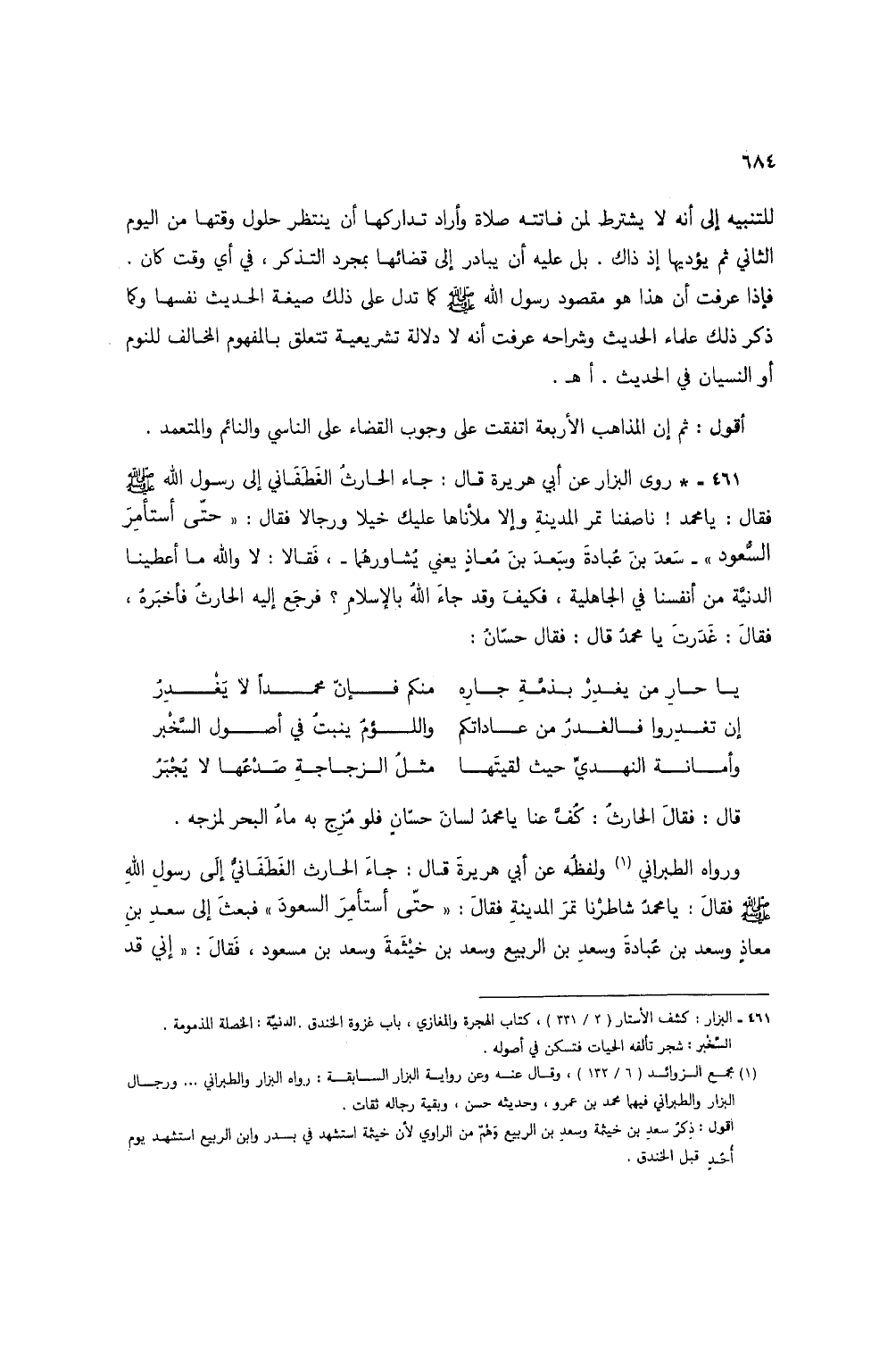 461 - * روى البزار عن أبي هريرة قال: جاء الحارث الغطفاني إلى رسول الله صلى الله عليه وسلم فقال: يا محمد! ناصفنا تمر المدينة وإلا ملأناها عليك خيلاً ورجالاً فقال: "حتى أستأمر السعود" - سعد بن عبادة وسعد بن معاذ يعني يشاورهما -، فقالا: لا والله ما أعطينا الدنية من أنفسنا في الجاهلية، فكيف وقد جاء الله بالإسلام؟ فرجع إليه الحارث فأخبره، فقال: غدرت يا محمد قال: فقال حسان: