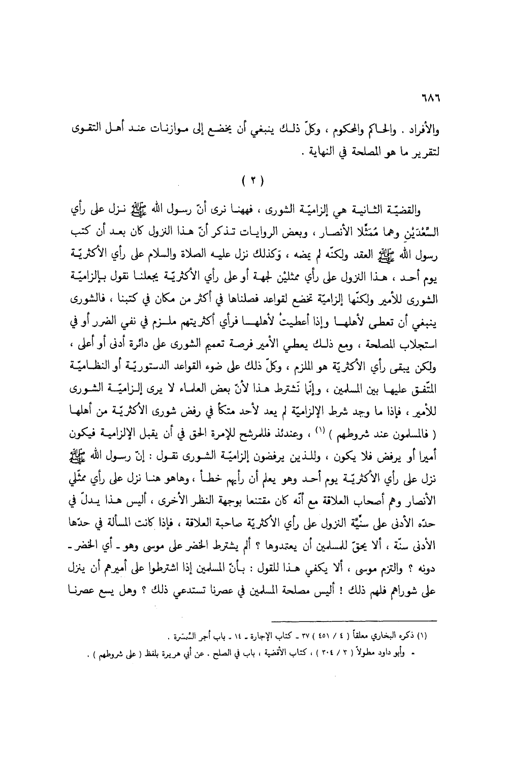والقضية الثانية هي إلزامية الشورى، فههنا نرى أن رسول الله صلى الله عليه وسلم نزل على رأي السعدين وهما ممثلا الأنصار، وبعض الروايات تذكر أن هذا النزول كان بعد أن كتب رسول الله صلى الله عليه وسلم العقد ولكنه لم يمضه، وكذلك نزل عليه الصلاة والسلام على رأي الأكثرية يوم أحد، هذا النزول على رأي ممثلين لجهة أو على رأي الأكثرية يجعلنا نقول بإلزامية الشورى للأمير ولكنها إلزامية تخضع لقواعد فصلناها في أكثر من مكان في كتبنا، فالشورى ينبغي أن تعطى لأهلها وإذا أعطيت لأهلها فرأي أكثريتهم ملزم في نفي الضرر أو في استجلاب المصلحة، ومع ذلك يعطي الأمير فرصة تعميم الشورى على دائرة أدنى أو أعلى، ولكن يبقى رأي الأكثرية هو الملزم، وكل ذلك على ضوء القواعد الدستورية أو النظامية المتفق عليها بين المسلمين، وإنما نشترط هذا لأن بعض العلماء لا يرى إلزامية الشورى للأمير، فإذا ما وجد شرط الإلزامية لم يعد لأحد متكأ في رفض شورى الأكثرية من أهلها (فالمسلمون عند شروطهم) (1)، وعندئذ فللمرشح للإمرة الحق في أن يقبل الإلزامية فيكون أميراً أو يرفض فلا يكون، وللذين يرفضون إلزامية الشورى نقول: إن رسول الله صلى الله عليه وسلم نزل على رأي الأكثرية يوم أحد وهو يعلم أن رأيهم خطأ، وها هو هنا نزل على رأي ممثلي الأنصار وهم أصحاب العلاقة مع أنه كان مقتنعاً بوجهة النظر الأخرى، أليس هذا يدل في حده الأدنى على سنية النزول على رأي الأكثرية صاحبة العلاقة، فإذا كانت المسألة في حدها الأدنى سنة، ألا يحق للمسلمين أن يعتمدوها؟ ألم يشترط الخضر على موسى وهو - أي الخضر - دونه؟ والتزم موسى، ألا يكفي هذا للقول: بأن المسلمين إذا اشترطوا على أميرهم أن ينزل على شوراهم فلهم ذلك! أليس مصلحة المسلمين في عصرنا تستدعي ذلك؟ وهل يسع عصرنا