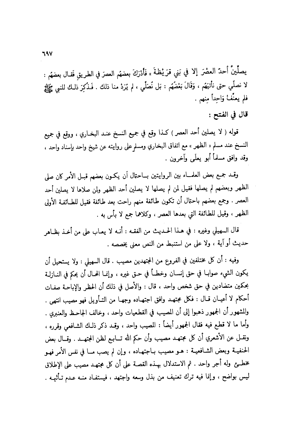 وفيه: أن كل مختلفين في الفروع من المجتهدين مصيب. قال السهيلي: ولا يستحيل أن يكون الشيء صواباً في حق إنسان وخطأ في حق غيره، وإنما المحال أن يحكم في النازلة بحكمين متضادين في حق شخص واحد، قال: والأصل في ذلك أن الحظر والإباحة صفات أحكام لا أعيان قال: فكل مجتهد وافق اجتهاده وجهاً من التأويل فهو مصيب انتهى. والمشهور أن الجمهور ذهبوا إلى أن المصيب في القطعيات واحد، وخالف الجاحظ والعنبري. وأما ما لا قطع فيه فقال الجمهور أيضاً: المصيب واحد، وقد ذكر ذلك الشافعي وقرره، ونقل عن الأشعري أن كل مجتهد مصيب وأن حكم الله تابع لظن المجتهد. وقال بعض الحنفية وبعض الشافعية: هو مصيب باجتهاده، وإن لم يصب ما في نفس الأمر فهو مخطئ وله أجر واحد. ثم الاستدلال بهذه القصة على أن كل مجتهد مصيب على الإطلاق ليس بواضح، وإنما فيه ترك تعنيف من بذل وسعه واجتهد، فيستفاد منه عدم تأثيمه.