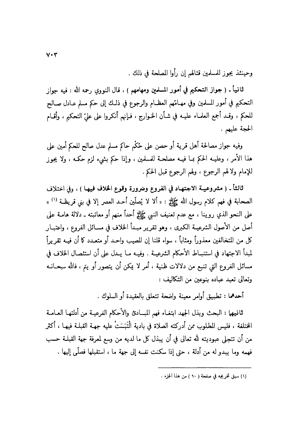 ثالثاً - (مشروعية الاجتهاد في الفروع وضرورة وقوع الخلاف فيها)، وفي اختلاف الصحابة في فهم كلام رسول الله صلى الله عليه وسلم: "ألا لا يصلين أحد العصر إلا في بني قريظة (1) " على النحو الذي روينا، مع عدم تعنيف النبي صلى الله عليه وسلم أحداً نهم أو معاتبته - دلالة هامة على أصل من الأصول الشرعية الكبرى، وهو تقرير مبدأ الخلاف في مسائل الفروع، واعتبار كل من المتخالفين معذوراً ومثاباً، سواء قلنا إن المصيب واحد أو متعدد كما أن فيه تقريراً لمبدأ الاجتهاد في استنباط الأحكام الشرعية. وفيه ما يدل على أن استئصال الخلاف في مسائل الفروع التي تنبع من دلالات ظنية، أمر لا يمكن أن يتصور أو يتم، فالله سبحانه وتعالى تعبد عباده بنوعين من التكاليف: