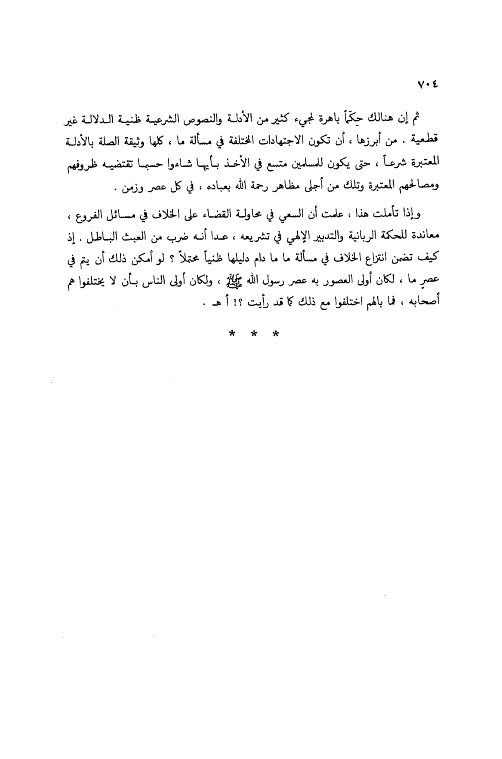 وإذا تأملت هذا، علمت أن السعي في محاولة القضاء على الخلاف في مسائل الفروع، معاندة للحكمة الربانية والتدبير الإلهي في تشريعه، عدا أنه ضرب من العبث الباطل. إذ كيف تضمن انتزاع الخلاف في مسألة ما ما دام دليلها ظنياً محتملاً؟ لو أمكن ذلك أن يتم في عصر ما، لكان أولى العصور به عصر رسول الله صلى الله عليه وسلم، ولكان أولى الناس بأن لا يختلفوا هم أصحابه، فما بالهم اختلفوا مع ذلك كما قد رأيت؟! أهـ.