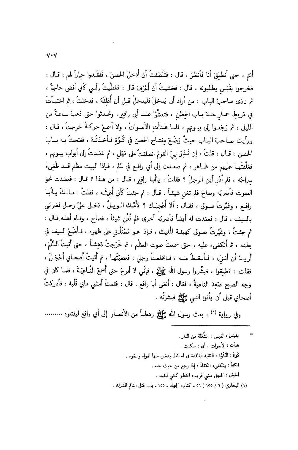 أنتم، حتى أنطلق أنا فأنظر، قال: فتلطفت أن أدخل الحصن، ففقدوا حماراً لهم، قال: فخرجوا بقبس يطلبونه، قال: فخشيت أن أعرف قال: فغطيت رأسي كأني أقضى حاجة، ثم نادى صاحب الباب: من أراد أن يدخل فليدخل قبل أن أغلقه، فدخلت، ثم اختبأت في مربط حمار عند باب الحصن، فتعشوا عند أبي رافع، وتحدثوا حتى ذهب ساعة من الليل، ثم رجعوا إلى بيوتهم، فلما هدأت الأصوات، ولا أسمع حركة خرجت، قال: ورأيت صاحب الباب حيث وضع مفتاح الحصن في كوة فأخذته، ففتحت به باب الحصن، قال: قلت: إن نذر بي القوم انطلقت على مهل، ثم عمدت إلى أبواب بيوتهم، فغلقتها عليهم من ظاهر، ثم صعدت إلى أبي رافع في سلم، فإذا البيت مظلم قد طفئ سراجه، فلم أدر أين الرجل؟ فقلت: يا أبا رافع، قال: من هذا؟ قال: فعمدت نحو الصوت فأضربه وصاح فلم تغن شيئاً. قال: ثم جئت كأني أغيثه، فقلت: مالك يا أبا رافع، وغيرت صوتي، فقال: ألا أعجبك؟ لأمك الويل، دخل علي رجل فضربني بالسيف، قال: فعمدت له أيضاً فأضربه أخرى فلم تغن شيئاً، فصاح، وقام أهله قال: ثم جئت، وغيرت صوتي كهيئة المغيث، فإذا هو مستلق على ظهره، فأضع السيف في بطنه، ثم أنكفئ عليه، حتى سمعت صوت العظم، ثم خرجت دهشاً، حتى أتيت السلم، أريد أن أنزل، فأسقط منه، فانخلعت رجلي، فعصبتها، ثم أتيت أصحابي أحجل، فقلت: انطلقوا، فبشروا رسول الله صلى الله عليه وسلم، فإني لا أبرح حتى أسمع الناعية، فلما كان في وجه الصبح صعد الناعية، فقال: أنعى أبا رافع، قال: فقمت أمشي ما بي قلبة، فأدركت أصحابي قبل أن يأتوا النبي صلى الله عليه وسلم فبشرته.