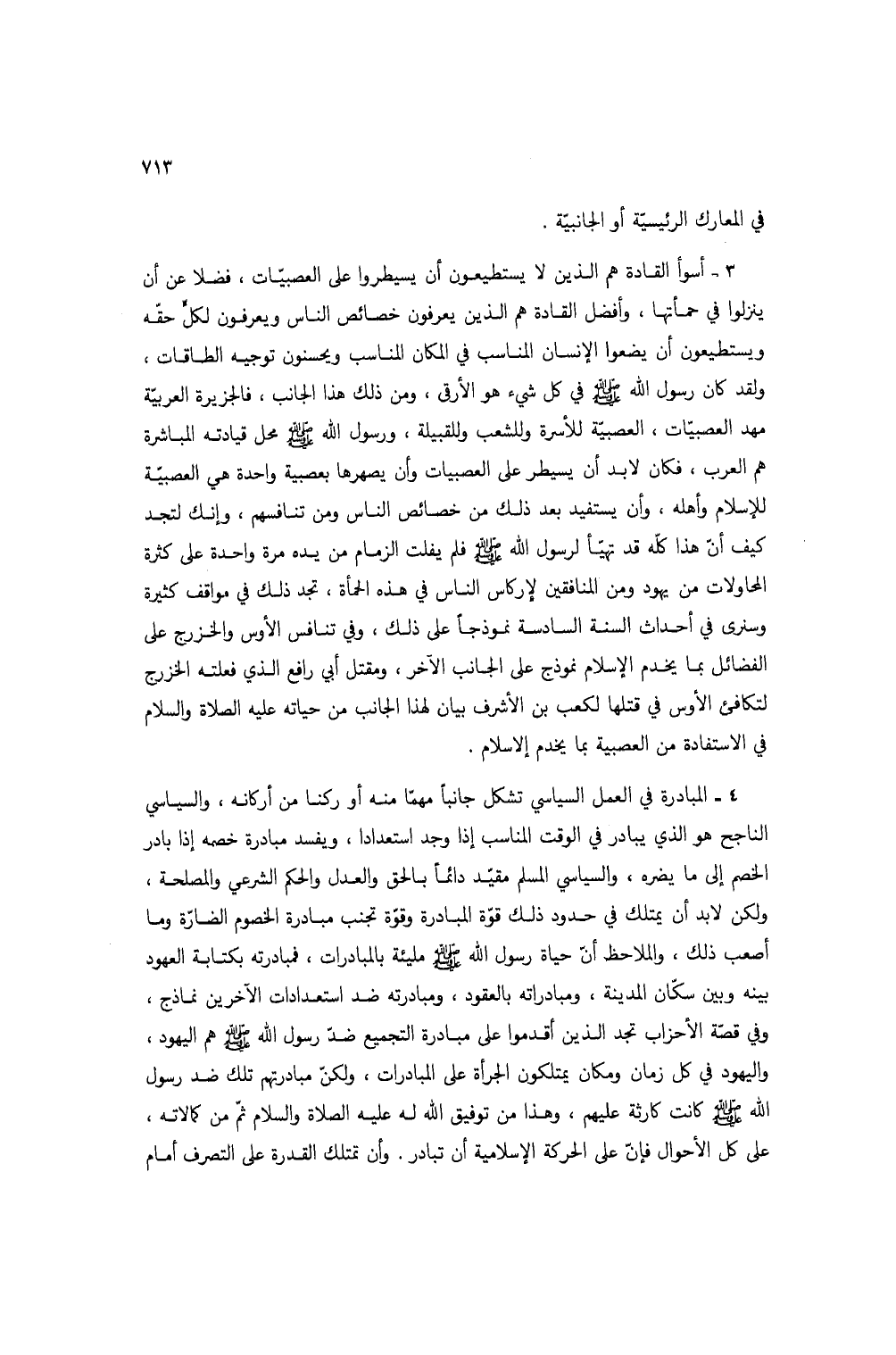 3 - أسوأ القادة هم الذين لا يستطيعون أن يسيطروا على العصبيات، فضلاً عن أن ينزلوا في حمأتها، وأفضل القادة هم الذين يعرفون خصائص الناس ويعرفون لكل حقه ويستطيعون أن يضعوا الإنسان المناسب في المكان المناسب ويحسنون توجيه الطاقات، ولقد كان رسول الله صلى الله عليه وسلم في كل شيء هو الأرقى، ومن ذلك هذا الجانب، فالجزيرة العربية مهد العصبيات، العصبية للأسرة وللشعب وللقبيلة، ورسول الله صلى الله عليه وسلم محل قيادته المباشرة هم العرب، فكان لابد أن يسيطر على العصبيات، وأن يصهرها بعصبية واحدة هي العصبية للإسلام وأهله، وأن يستفيد بعد ذلك من خصائص الناس ومن تنافسهم، وإنك لتجد كيف أن هذا كله قد تهيأ لرسول الله صلى الله عليه وسلم فلم يفلت الزمام من يده مرة واحدة على كثرة المحاولات من يهود ومن المنافقين لإركاس الناس في هذه الحمأة، تجد ذلك في مواقف كثيرة وسنرى في أحداث السنة السادسة نموذجاً على ذلك، وفي تنافس الأوس والخزرج على الفضائل بما يخدم الإسلام نموذج على الجانب الآخر، ومقتل أبي رافع الذي فعلته الخزرج لتكافئ الأوس في قتلها لكعب بن الأشرف بيان لهذا الجانب من حياته عليه الصلاة والسلام في الاستفادة من العصبية بما يخدم الإسلام.