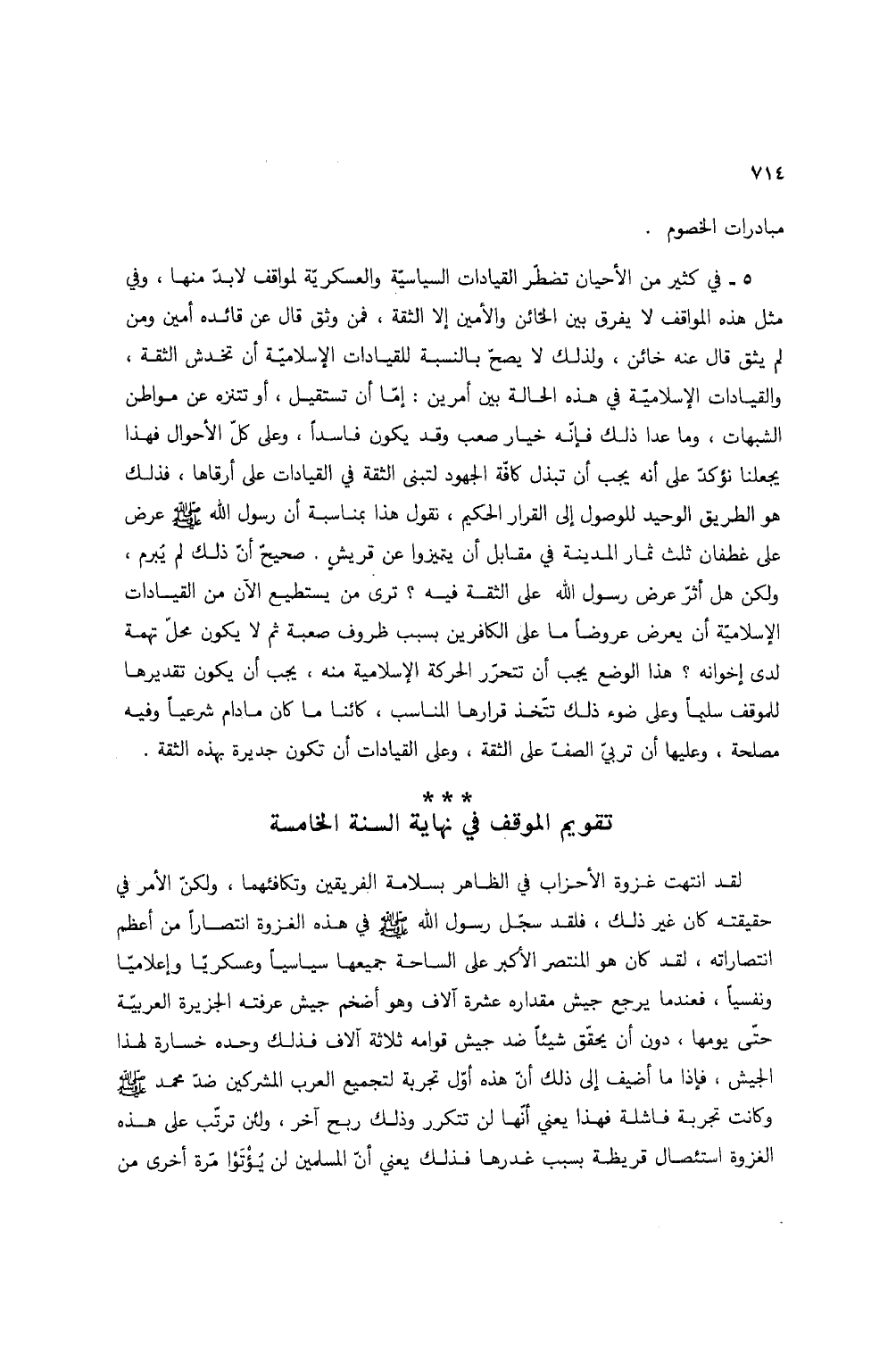 5 - في كثير من الأحيان تضطر القيادات السياسية والعسكرية لمواقف لابد منها، وفي مثل هذه المواقف لا يفرق بين الخائن والأمين إلا الثقة، فمن وثق قال عن قائده أمين ومن لم يثق قال عنه خائن، ولذلك لا يصح بالنسبة للقيادات الإسلامية أن تخدش الثقة، والقيادات الإسلامية في هذه الحالة بين أمرين: إما أن تستقيل، أو تتنزه عن مواطن الشبهات، وما عدا ذلك فإنه خيار صعب وقد يكون فاسداً، وعلى كل الأحوال فهذا يجعلنا نؤكد على أنه يجب أن تبذل كافة الجهود لتبنى الثقة في القيادات على أرقاها، فذلك هو الطريق الوحيد للوصول إلى القرار الحكيم، نقول هذا بمناسبة أن رسول الله صلى الله عليه وسلم عرض على غطفان ثلث ثمار المدينة في مقابل أن يتميزوا عن قريش. صحيح أن ذلك لم يبرم، ولكن هل أثر عرض رسول الله على الثقة فيه؟ ترى من يستطيع الآن من القيادات الإسلامية أن يعرض عروضاً ما على الكافرين بسبب ظروف صعبة ثم لا يكون محل تهمة لدى إخوانه؟ هذا الوضع يجب أن تتحرر الحركة الإسلامية منه، يجب أن يكون تقديرها للموقف سليماً وعلى ضوء ذلك تتخذ قرارها المناسب، كائناً ما كان ما دام شرعياً وفيه مصلحة، وعليها أن تربي الصف على الثقة، وعلى القيادات أن تكون جديرة بهذه الثقة.