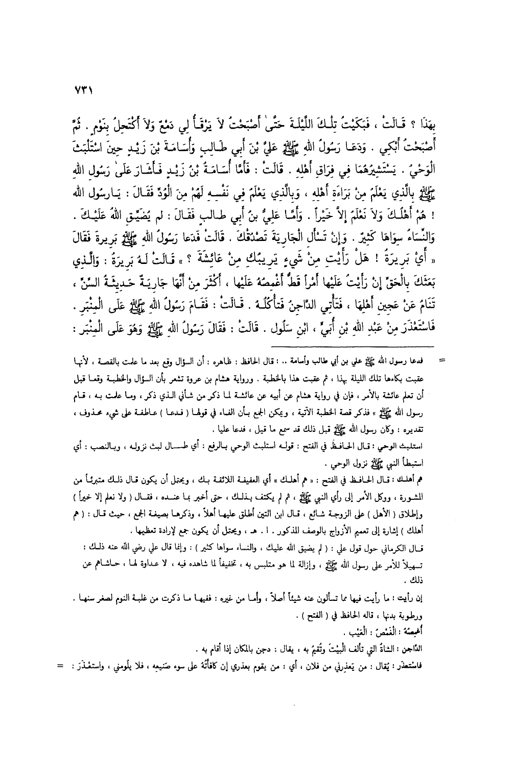 = فدعا رسول الله صلى الله عليه وسلم علي بن أبي طالب وأسامة .. : قال الحافظ: ظاهره: أن السؤال وقع بعد ما علمت بالقصة، لأنها عقبت بكاءها تلك الليلة بهذا، ثم عقبت هذا بالخطبة. ورواية هشام بن عروة تشعر بأن السؤال والخطبة وقعا قبل أن تعلم عائشة بالأمر، فإن في رواية هشام عن أبيه عن عائشة لما ذكر من شأني الذي ذكر، وما علمت به، قام رسول الله صلى الله عليه وسلم" فذكر قصة الخطبة الآتية، ويمكن الجمع بأن الفاء في قولها (فدعا) عاطفة على شيء محذوف، تقديره: وكان رسول الله صلى الله عليه وسلم قبل ذلك قد سمع ما قيل، فدعا عليا.