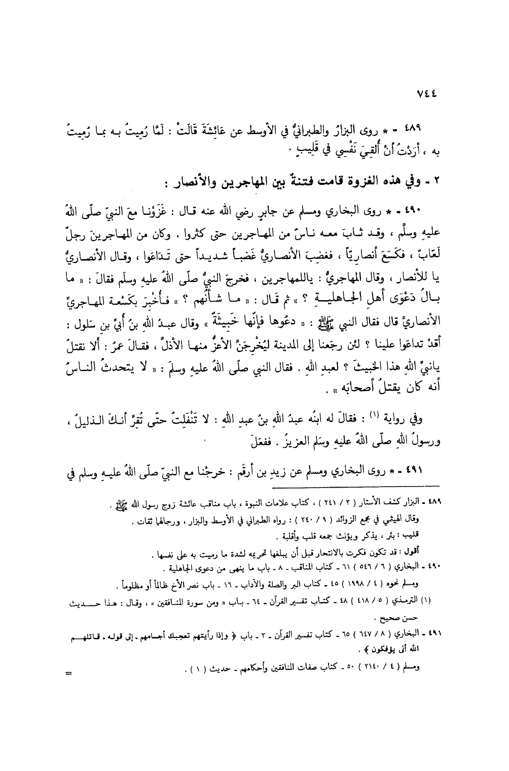 490 - * روى البخاري ومسلم عن جابر رضي الله عنه قال: غزونا مع النبي صلى الله عليه وسلم، وقد ثاب معه ناس من المهاجرين حتى كثروا. وكان من المهاجرين رجل لعاب، فكسع أنصارياً، فغضب الأنصاري غضباً شديداً حتى تداعوا، وقال الأنصاري يا للأنصار، وقال المهاجري: يا للمهاجرين، فخرج النبي صلى الله عليه وسلم فقال: "ما بال دعوى أهل الجاهلية؟ " ثم قال: "ما شأنهم؟ " فأخبر بكسعة المهاجري الأنصاري قال فقال النبي صلى الله عليه وسلم: "دعوها فإنها خبيثة" وقال عبد الله بن أبي بن سلول: أقد تداعوا علينا؟ لئن رجعنا إلى المدين ليخرجن الأعز منها الأذل، فقال عمر: ألا نقتل يا نبي الله هذا الخبيث؟ لعبد الله. فقال النبي صلى الله عليه وسلم: "لا يتحدث الناس أنه كان يقتل أصحابه".