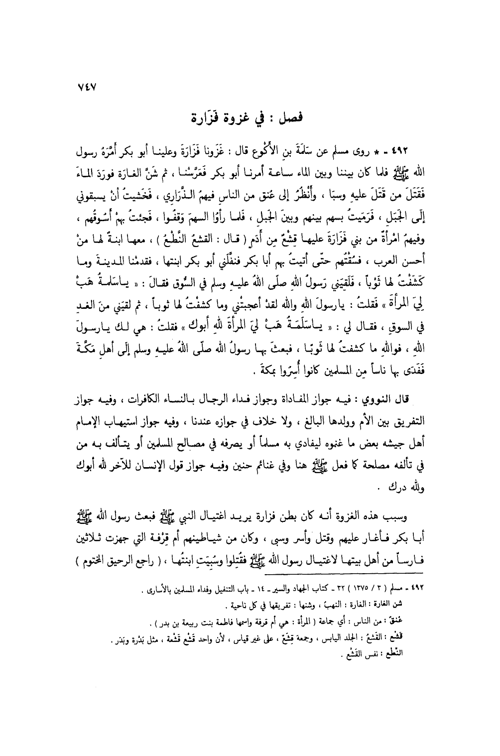 492 - * روى مسلم عن سلمة بن الأكوع قال: غزونا فزارة وعلينا أبو بكر أمره رسول الله صلى الله عليه وسلم فلما كان بيننا وبين الماء ساعة أمرنا أبو بكر فعرسنا، ثم شن الغارة فورد الماء فقتل من قتل عليه وسبا، وأنظر إلى عنق من الناس فيهم الذراري، فخشيت أن يسبقوني إلى الجبل، فرميت بسهم بينهم وبين الجبل، فلما رأوا السهم وقفوا، فجئت بهم أسوقهم، وفيهم امرأة من بني فزارة عليها قشع من أدم (قال: القشع النطع)، معها ابنة لها من أحسن العرب، فسقتهم حتى أتيت بهم أبا بكر فنفلني أبو بكر ابنتها، فقدمنا المدينة وما كشفت لها ثوباً، فلقيني رسول الله صلى الله عليه وسلم في السوق فقال: "يا سلمة هب لي المرأة" فقلت: يا رسول الله والله لقد أعجبتني وما كشفت لها ثوباً، ثم لقيني من الغد في السوق، فقال لي: "يا سلمة هب لي المرأة لله أبوك" فقلت: هي لك يا رسول الله، فوالله ما كشفت لها ثوباً، فبعث بها رسول الله صلى الله عليه وسلم إلى أهل مكة ففدى بها ناساً من المسلمين كانوا أسروا بمكة.