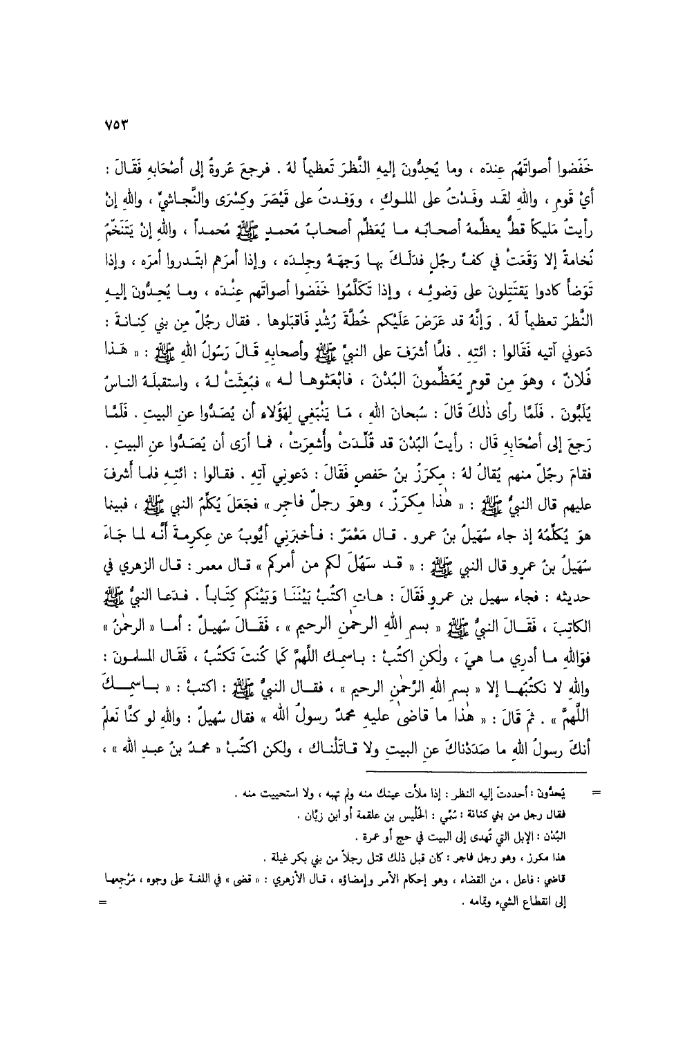 خفضوا أصواتهم عنده، وما يحدون إليه النظر تعظيماً له. فرجع عروة إلى أصحابه فقال: أي قوم، والله لقد وفدت على الملوك، ووفدت على قيصر وكسرى والنجاشي، والله إن رأيت مليكاً قط يعظمه أصحابه ما يعظم أصحاب محمد صلى الله عليه وسلم محمداً، والله إن يتنخم نخامة إلا وقعت في كف رجل فدلك بها وجهه وجلده، وإذا أمرهم ابتدروا أمره، وإذا توضأ كادوا يقتتلون على وضوئه، وإذا تكلموا خفضوا أصواتهم عنده، وما يحدون إليه النظر تعظيماً له. وإنه قد عرض عليكم خطة رشد فاقبلوها. فقال رجل من بني كنانة: دعوني آتيه فقالوا: ائته. فلما أشرف على النبي صلى الله عليه وسلم وأصحابه قال رسول الله صلى الله عليه وسلم: "هذا فلان، وهو من قوم يعظمون البدن، فابعثوها له" فبعثت له، واستقبله الناس يلبون. فلما رأى ذلك قال: سبحان الله، ما ينبغي لهؤلاء أن يصدوا عن البيت. فلما رجع إلى أصحابه قال: رأيت البدن قد قلدت وأشعرت، فما أرى أن يصدوا عن البيت. فقام رجل منهم يقال له: مكرز بن حفص فقال: دعوني آتهز فقالوا: ائته فلما أشرف عليهم قال النبي صلى الله عليه وسلم: "هذا مكرز، وهو رجل فاجر" فجعل يكلم النبي صلى الله عليه وسلم، فبينما هو يكلمه إذ جاء سهيل بن عمرو. قال معمر: فأخبرني أيوب عن عكرمة أنه لما جاء سهيل بن عمرو قال النبي صلى الله عليه وسلم: "قد سهل لكم من أمركم" قال معمر: قال الزهري في حديثه: فجاء سهيل بن عمرو فقال: هات اكتب بيننا وبينكم كتاباً. فدعا النبي صلى الله عليه وسلم الكاتب، فقال النبي صلى الله عليه وسلم "بسم الله الرحمن الرحيم"، فقال سهيل: أما "الرحمن" فوالله ما أدري ما هي، ولكن اكتب: باسمك اللهم كما كنت تكتب، فقال المسلمون: والله لا نكتبها إلا "بسم الله الرحمن الرحيم"، فقال النبي صلى الله عليه وسلم: اكتب: "باسمك اللهم". ثم قال: "هذا ما قاضى عليه محمد رسول الله" فقال سهيل: والله لو كنا نعلم أنك رسول الله ما صددناك عن البيت ولا قاتلناك، ولكن اكتب "محمد بن عبد الله"،