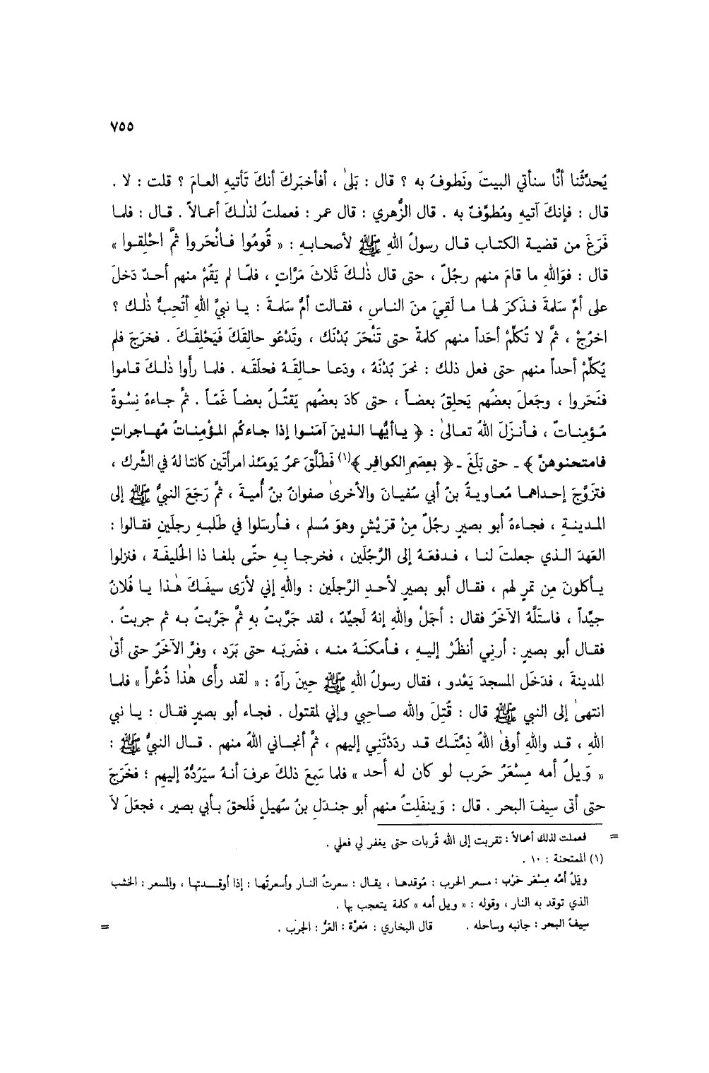 يحدثنا أنا سنأتي البيت ونطوف به؟ قال: بلى، أفأخبرك أنك تأتيه العام؟ قلت: لا. قال: فإنك آتيه ومطوف به. قال الزهري: قال عمر: فعملت لذلك أعمالاً. قال: فلما فرغ من قضية الكتاب قال رسول الله صلى الله عليه وسلم لأصحابه: "قوموا فانحروا ثم احلقوا" قال: فوالله ما قام منهم رجل، حتى قال ذلك ثلاث مرات، فلما لم يقم منهم أحد دخل على أم سلمة فذكر لها ما لقي من الناس، فقالت أم سلمة: يا نبي الله أتحب ذلك؟ اخرج، ثم لا تكلم أحداً منهم كلمة حتى تنحر بدنك، وتدعو حالقك فيحلقك. فخرج فلم يكلم أحداً منهم حتى فعل ذلك: نحر بدنه، ودعا حالقه فحلقه. فلما رأوا ذلك قاموا فنحروا، وجعل بعضهم يحلق بعضاً، حتى كاد بعضهم يقتل بعضاً غماً. ثم جاءه نسوة مؤمنات، فأنزل الله تعالى: (يا أيها الذين آمنوا إذا جاءكم المؤمنات مهاجرات فامتحنوهن) - حتى بلغ - (بعصم الكوافر) (1) فطلق عمر يومئذ امرأتين كانتا له في الشرك، فتزوج إحداهما معاوية بن أبي سفيان والأخرى صفوان بن أمية، ثم رجع النبي صلى الله عليه وسلم إلى المدينة، فجاءه أبو بصير رجل من قريش وهو مسلم، فأرسلوا في طلبه رجلين فقالوا: العهد الذي جعلت لنا، فدفعه إلى الرجلين، فخرجا به حتى بلغا ذا الحليفة، فنزلوا يأكلون من تمر لهم، فقال أبو بصير لأحد الرجلين: والله إني لأرى سيفك هذا يا فلان جيداً، فاستله الآخر فقال: أجل والله إنه لجيد، لقد جربت به ثم جربت به ثم جربت. فقال أبو بصير: أرني أنظر إليه، فأمكنه منه، فضربه حتى برد، وفر الآخر حتى أتى المدينة، فدخل المسجد يعدو، فقال رسول الله صلى الله عليه وسلم حين رآه: "لقد رأى هذا ذعراً" فلما انتهى إلى النبي صلى الله عليه وسلم قال: قتل والله صاحبي وإني لمقتول. فجاء أبو بصير فقال: يا نبي الله، قد والله أوفى الله ذمتك قد رددتني إليهم، ثم أنجاني الله منهم. قال النبي صلى الله عليه وسلم: "ويل أمه مسعر حرب لو كان له أحد" فلما سمع ذلك عرف أنه سيرده إليهم؛ فخرج حتى أتى سيف البحر. قال: وينفلت منهم أبو جندل بن سهيل فلحق بأبي بصير، فجعل لا