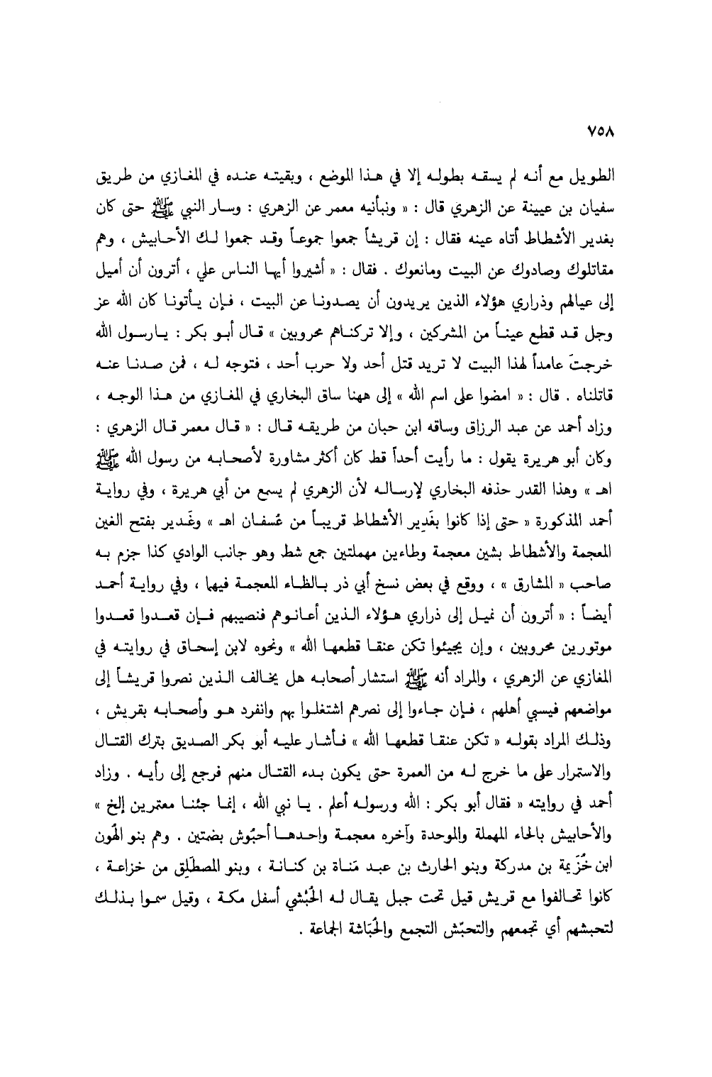 الطويل مع أنه لم يسقه بطوله إلا في هذا الموضع، وبقيته عنده في المغازي من طريق سفيان بن عيينة عن الزهري قال: "ونبأنيه معمر عن الزهري: وسار النبي صلى الله عليه وسلم حتى كان بغدير الأشطاط أتاه عينه فقال: إن قريشاً جمعوا جموعاً وقد جمعوا لك الأحابيش، وهم مقاتلوك وصادوك عن البيت ومانعوك. فقال: "أشيروا أيها الناس علي، أترون أن أميل إلى عيالهم وذراري هؤلاء الذين يريدون أن يصدونا عن البيت، فإن يأتونا كان الله عز وجل قد قطع عيناً من المشركين، وإلا تركناهم محروبين" قال أبو بكر: يا رسول الله خرجت عامداً لهذا البيت لا تريد قتل أحد ولا حرب أحد، فتوجه له، فمن صدنا عنه قاتلناه. قال: "امضوا على اسم الله" إلى ههنا ساق البخاري في المغازي من هذا الوجه، وزاد أحمد عن عبد الرزاق وساقه ابن حبان من طريقه قال: "قال معمر قال الزهري: وكان أبو هريرة يقول: ما رأيت أحداً قط كان أكثر مشاورة لأصحابه من رسول الله صلى الله عليه وسلم اهـ" وهذا القدر حذفه البخاري لإرساله لأن الزهري لم يسمع من أبي هريرة، وفي رواية أحمد المذكورة "حتى إذا كانوا بغدير الأشطاط قريباً من عسفان اهـ" وغدير بفتح الغين المعجمة والأشطاط بشين معجمة وطاءين مهملتين جمع شط وهو جانب الوادي كذا جزم به صاحب "المشارق"، ووقع في بعض نسخ أبي ذر بالظاء المعجمة فيهما، وفي رواية أحمد أيضاً: "أترون أن نميل إلى ذراري هؤلاء الذين أعانوهم فنصيبهم فإن قعدوا قعدوا موتورين محروبين، وإن يجيئوا تكن عنقاً قطعها الله" ونحوه لابن إسحاق في روايته في المغازي عن الزهري، والمراد أنه صلى الله عليه وسلم استشار أصحابه هل يخالف الذين نصروا قريشاً إلى مواضعهم فيسبي أهلهم، فإن جاءوا إلى نصرهم اشتغلوا بهم وانفرد هو وأصحابه بقريش، وذلك المراد بقوله "تكن عنقاً قطعها الله" فأشار عليه أبو بكر الصديق بترك القتال والاستمرار على ما خرج له من العمرة حتى يكون بدء القتال منهم فرجع إلى رأيه. وزاد أحمد في روايته "فقال أبو بكر: الله ورسوله أعلم. يا نبي الله، إنما جئنا معتمرين إلخ" والأحابيش بالحاء المهملة والموحدة وآخره معجمة واحدها أحبوش بضمتين. وهم بنو الهون ابن خزيمة بن مدركة وبنو الحارث بن عبد مناة بن كنانة، وبنو المصطلق من خزاعة، كانوا تحالفوا مع قريش قيل تحت جبل يقال له الحبشي أسفل مكة، وقيل سموا بذلك لتحبشهم أي تجمعهم والتحبش التجمع والحباشة الجماعة.