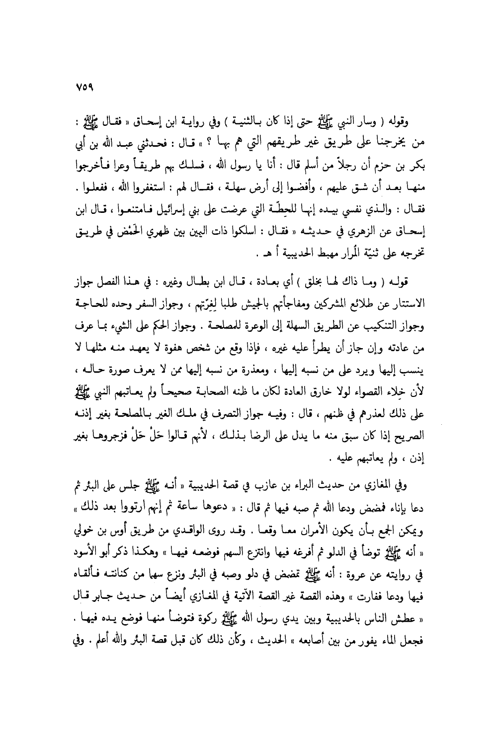 وفي المغازي من حديث البراء بن عازب في قصة الحديبية "أنه صلى الله عليه وسلم جلس على البئر ثم دعا بإناء فمضمض ودعا الله ثم صبه فيها ثم قال: "دعوها ساعة ثم إنهم ارتووا بعد ذلك" ويمكن الجمع بأن يكون الأمران معاً وقعا. وقد روى الواقدي من طريق أوس بن خولي "أنه صلى الله عليه وسلم توضأ في الدلو ثم أفرغه فيها وانتزع السهم فوضعه فيها" وهكذا ذكر أبو الأسود في روايته عن عروة: أنه صلى الله عليه وسلم تمضمض في دلو وصبه في البئر ونزع سهماً من كنانته فألقاه فيها ودعا ففارت" وهذه القصة غير القصة الآتية في المغازي أيضاً من حديث جابر قال "عطش الناس بالحديبية وبين يدي رسول الله صلى الله عليه وسلم ركوة فتوضأ منها فوضع يده فيها. فجعل الماء يفور من بين أصابعه" الحديث، وكأن ذلك كان قبل قصة البئر والله أعلم. وفي