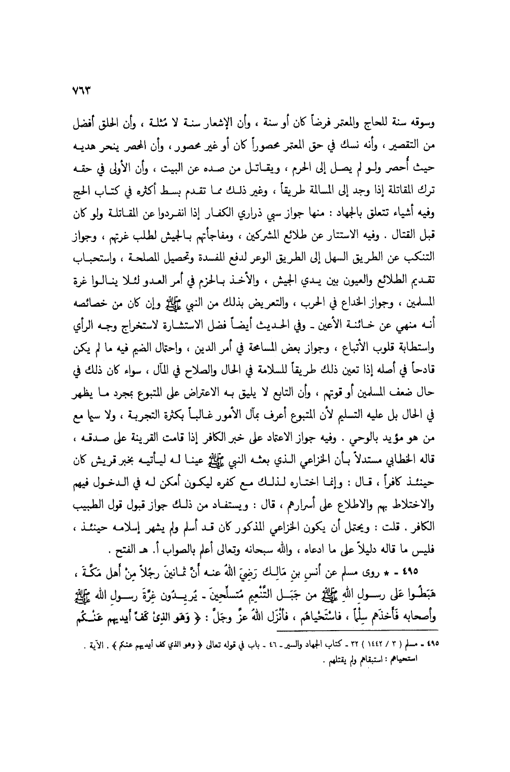 وسوقه سنة للحاج والمعتمر فرضاً كان أو سنة، وأن الإشعار سنة لا مثلة، وأن الحلق أفضل من التقصير، وأنه نسك في حق المعتمر محصوراً كان أو غير محصور، وأن المحصر ينحر هديه حيث أحصر ولو لم يصل إلى الحرم، ويقاتل من صده عن البيت، وأن الأولى في حقه ترك المقاتلة إذا وجد إلى المسالمة طريقاً، وغير ذلك مما تقدم بسط أكثره في كتاب الحج وفيه أشياء تتعلق بالجهاد: منها جواز سبي ذراري الكفار إذا انفردوا عن المقاتلة ولو كان قبل القتال. وفيه الاستتار عن طلائع المشركين، ومفاجأتهم بالجيش لطلب غرتهم، وجواز التنكب عن الطريق السهل إلى الطريق الوعر لدفع المفسدة وتحصيل المصلحة، واستحباب تقديم الطلائع والعيون بين يدي الجيش، والأخذ بالحزم في أمر العدو لئلا ينالوا غرة المسلمين، وجواز الخداع في الحرب، والتعريض بذلك من النبي صلى الله عليه وسلم وإن كان من خصائصه أنه منهي عن خائنة الأعين - وفي الحديث أيضاً فضل الاستشارة لاستخراج وجه الرأي واستطابة قلوب الأتباع، وجواز بعض المسامحة في أمر الدين، واحتمال الضيم فيه ما لم يكن قادحاً في أصله إذا تعين ذلك طريقاً للسلامة في الحال والصلاح في المآل، سواء كان ذلك في حال ضعف المسلمين أو قوتهم، وأن التابع لا يليق به الاعتراض على المتبوع بمجرد ما يظهر في الحال بل عليه التسليم لأن المتبوع أعرف بمآل الأمور غالباً بكثرة التجربة، ولا سيما مع من هو مؤيد بالوحي. وفيه جواز الاعتماد على خبر الكافر إذا قامت القرينة على صدقه، قاله الخطابي مستدلاً بأن الخزاعي الذي بعثه النبي صلى الله عليه وسلم عيناً له ليأتيه بخبر قريش كان حينئذ كافراً، قال: وغنما اختاره لذلك مع كفره ليكون أمكن له في الدخول فيهم والاختلاط بهم والاطلاع على أسرارهم، قال: ويستفاد من ذلك جواز قبول قول الطبيب الكافر. قلت: ويحتمل أن يكون الخزاعي المذكور كان قد أسلم ولم يشهر إسلامه حينئذ، فليس ما قاله دليلاً على ما ادعاه، والله سبحانه وتعالى أعلم بالصواب أ. هـ الفتح.
