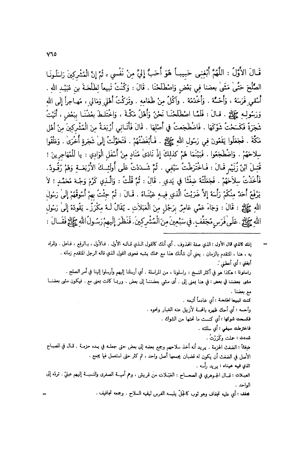 قال الأول: اللهم أبغنى حبيباً هو أحب إلي من نفسي" ثم إن المشركين راسلونا الصلح حتى مشى بعضنا في بعض واصطلحنا. قال: وكنت تبيعاً لطلحة بن عبيد الله. أسقي فرسه، وأحسه. وأخدمه. وآكل من طعامه. وتركت أهلي ومالي، مهاجراً إلى الله ورسوله صلى الله عليه وسلم. قال: فلما اصطلحنا نحن وأهل مكة، واختلط بعضنا ببعض، أتيت شجرة فكسحت شوكها. فاضطجعت في أصلها. قال فأتاني أربعة من المشركين من أهل مكة. فجعلوا يقعون في رسول الله صلى الله عليه وسلم. فأبغضتهم. فتحولت إلى شجرة أخرى. وعلقوا سلاحهم. واضطجعوا. فبينما هم كذلك إذ نادى مناد من أسفل الوادي: يا للمهاجرين! قتل ابن زنيم قال: فاخترطت سيفي. ثم شددت على أولئك الأربعة وهم رقود. فأخذت سلاحهم. فجعلته ضغثاً في يدي. قال: ثم قلت: والذي كرم وجه محمد! لا يرفع أحد منكم رأسه إلا ضربت الذي فيه عيناه. قال: ثم جئت بهم أسوقهم إلى رسول الله صلى الله عليه وسلم: قال: وجاء عمي عامر برجل من العبلات - يقال له مكرز - يقوده على رسول الله صلى الله عليه وسلم. على فرس مجفف. في سبعين من المشركين. فنظر غليهم رسول الله صلى الله عليه وسلم فقال: (1)