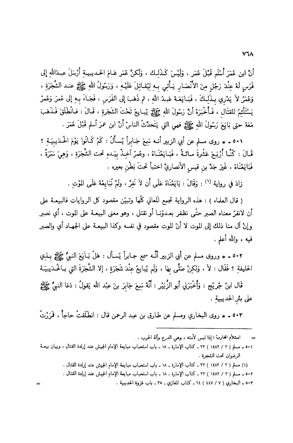 501 - * روى مسلم عن أبي الزبير أنه سمع جابراً يسأل: كم كانوا يوم الحديبية؟ قال: كنا أربع عشرة مائة، فبايعناه، وعمر آخذ بيده تحت الشجرة، وهي سمرة، فبايعناه، غير جد بن قيس الأنصاري اختبأ تحت بطن بعيره.
