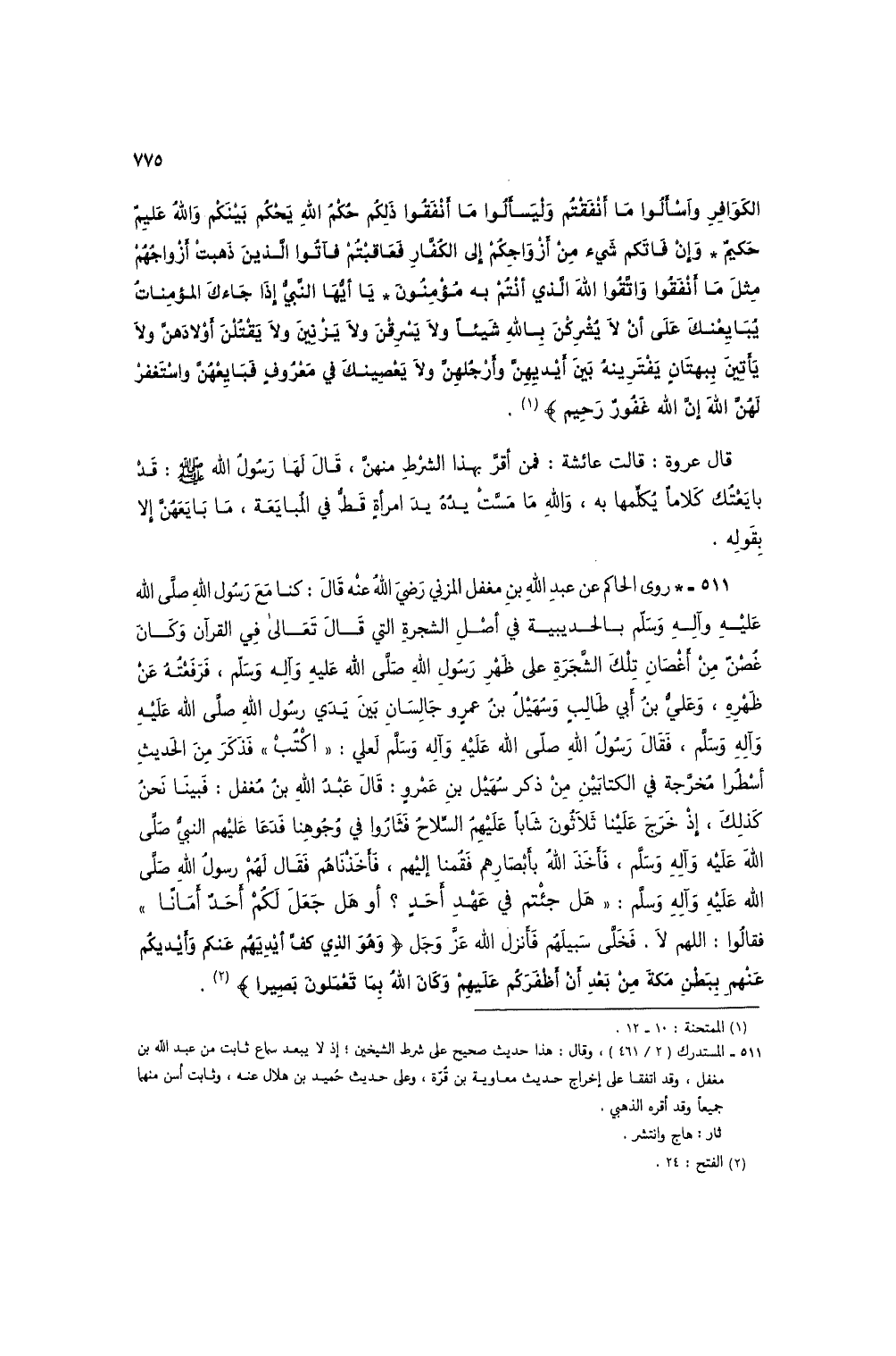 511 - * روى الحاكم عن عبد الله بن مغفل المزني رضي الله عنه قال: كنا مع رسول الله صلى الله عليه وآله وسلم بالحديبية في أصل الشجرة التي قال تعالى في القرآن وكان غصن من أغصان تلك الشجرة على ظهر رسول الله صلى الله عليه وآله وسلم، فرفعته عن ظهره، وعلي بن أبي طالب وسهيل بن عمرو جالسان بين يدي رسول الله صلى الله عليه وآله وسلم، فقال رسول الله صلى الله عليه وآله وسلم لعلي: "اكتب" فذكر من الحديث أسطراً مخرجة في الكتابين من ذكر سهيل بن عمرو: قال عبد الله بن مغفل: فبينا نحن كذلك، إذ خرج علينا ثلاثون شاباً عليهم السلاح فثاروا في وجوهنا فدعا عليهم النبي صلى الله عليه وآله وسلم، فأخذ الله بأبصارهم فقمنا إليهم، فأخذناهم فقال لهم رسول الله صلى الله عليه وآله وسلم: "هل جئتم في عهد أحد؟ أو هل جعل لكم أحد أمانا" فقالوا: اللهم لا. فخلى سبيلهم فأنزل الله عز وجل (وهو الذي كف أيديهم عنكم وأيديكم عنهم ببطن مكة من بعد أن أظفركم عليهم وكان الله بما تعملون بصيرا) (3).