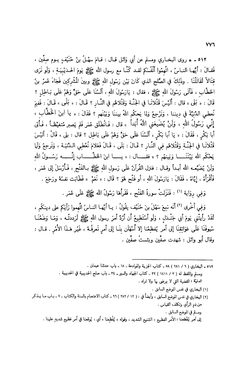 512 - * روى البخاري ومسلم عن أبي وائل قال: قام سهل بن حنيف يوم صفين، فقال: أيها الناس، اتهموا أنفسكم لقد كنا مع رسول الله صلى الله عليه وسلم يوم الحديبية، ولو نرى قتالاً لقاتلنا. وذلك في الصلح الذي كان بين رسول الله صلى الله عليه وسلم وبين المشركين فجاء عمر بن الخطاب، فأتى رسول الله صلى الله عليه وسلم، فقال: يا رسول الله، ألسنا على حق وهم على باطل؟ قال: "بلى" قال: أليس قتلانا في الجنة وقتلاهم في النار؟ قال: "بلى" قال: ففيم نعطي الدنية في ديننا، ونرجع ولما يحكم الله بيننا وبينهم؟ فقال: "يا ابن الخطاب، إني رسول الله، ولن يضيعني الله أبداً" قال: فانطلق عمر فلم يصبر متغيظاً، فأتى أبا بكر، فقال: "يا أبا بكر، ألسنا على حق وهم على باطل؟ قال: بلى، قال: أليس قتلانا في الجنة وقتلاهم في النار؟ قال: بلى، قال فعلام نعطي الدنية، ونرجع ولما يحكم الله بيننا وبينهم؟ " فقال: "يا ابن الخطاب إنه رسول الله ولن يضيعه الله أبداً وقال: فنزل القرآن على رسول الله صلى الله عليه وسلم بالفتح، فأرسل إلى عمر، فأقرأه، إياه، فقال: يا رسول الله، أو فتح هو؟ قال: "نعم" فطابت نفسه ورجع.