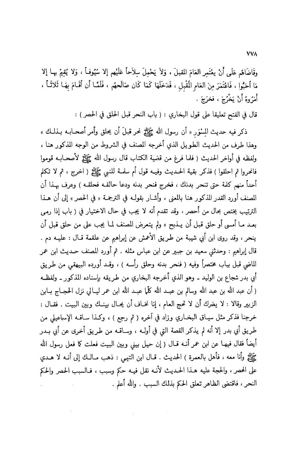 قال في الفتح تعليقاً على قول البخاري: (باب النحر قبل الحلق في الحصر):
