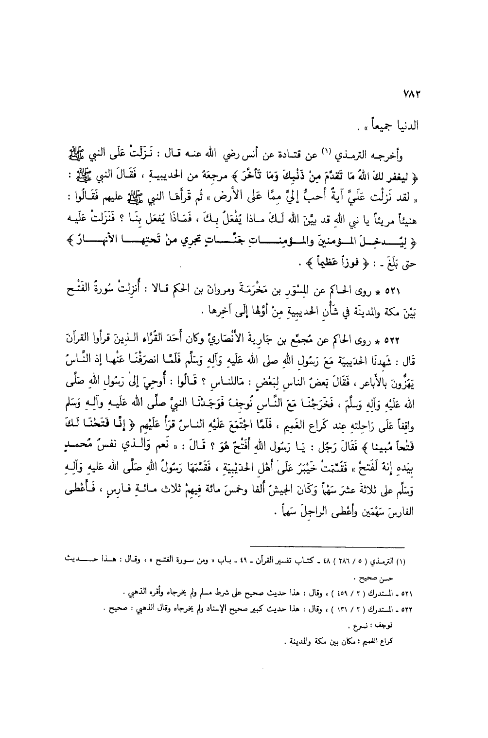 521 - * روى الحاكم عن المسور بن مخرمة ومروان بن الحكم قالا: أنزلت سورة الفتح بين مكة والمدينة في شأن الحديبية من أولها إلى آخرها.