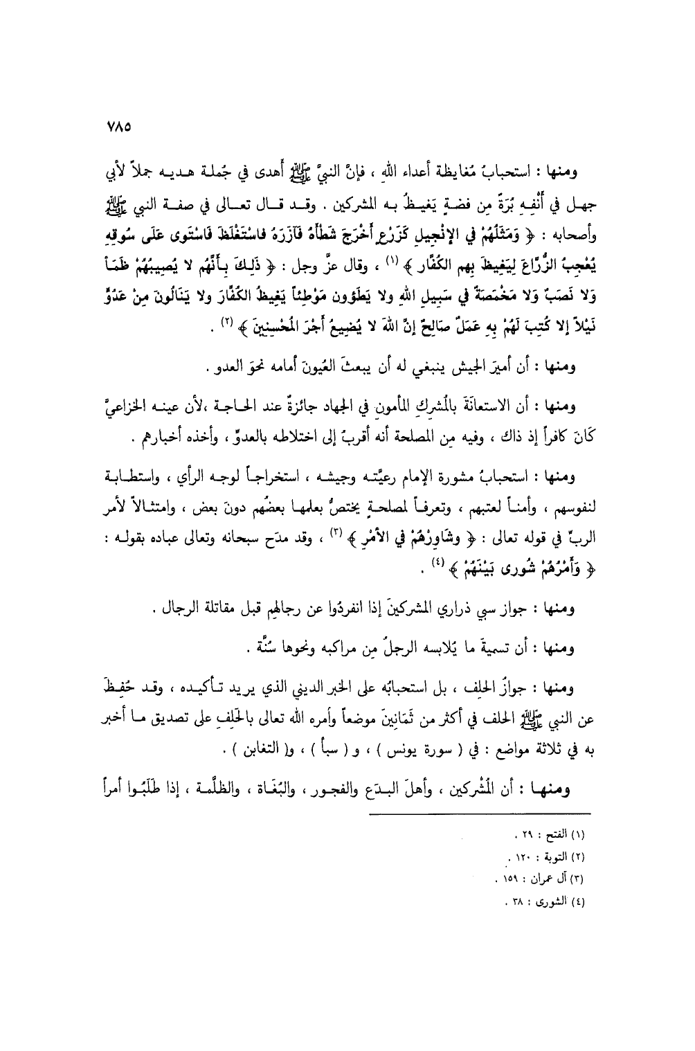 ومنها: استحباب مشورة الإمام رعيته وجيشه، استخراجاً لوجه الرأي، واستطابة لنفوسهم، وأمناً لعتبهم، وتعرفاً لمصلحة يختص بعلمها بعضهم دون بعض، وامتثالاً لأمر الرب في قوله تعالى: (وشاورهم في الأمر) (3)، وقد مدح سبحانه وتعالى عباده بقوله: (وأمرهم شورى بينهم) (4).