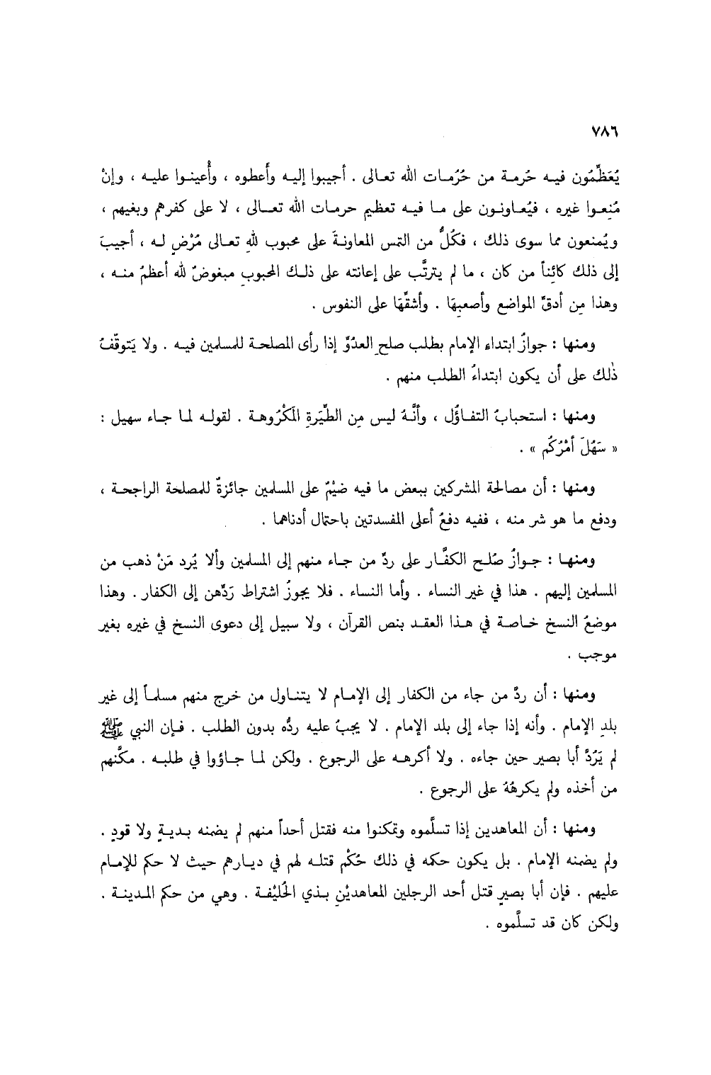 ومنها: جواز صلح الكفار على رد من جاء منهم إلى المسلمين وألا يرد من ذهب من المسلمين غليهم. هذا في غير النساء. وأما النساء. فلا يجوز اشتراط ردهن إلى الكفار. وهذا موضع النسخ خاصة في هذا العقد بنص القرآن، ولا سبيل إلى دعوى النسخ في غيره بغير موجب.