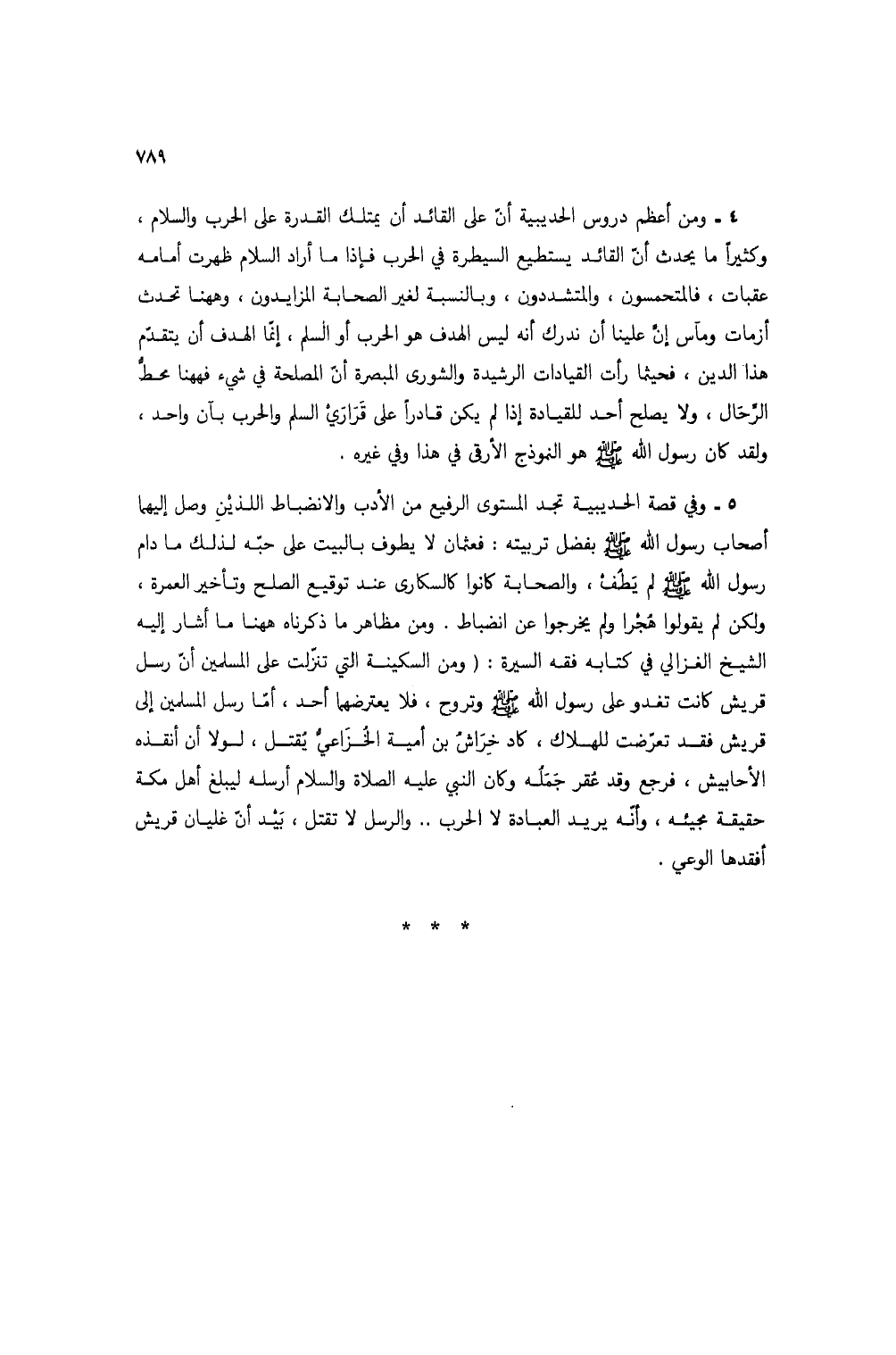 4 - ومن أعظم دروس الحديبية أن على القائد أن يمتلك القدرة على الحرب والسلام، وكثيراً ما يحدث أن القائد يستطيع السيطرة في الحرب فإذا ما أراد السلام ظهرت أمامه عقبات، فالمتحمسون، والمتشددون، وبالنسبة لغير الصحابة المزايدون، وههنا تحدث أزمات ومآس إن علينا أن ندرك أنه ليس الهدف هو الحرب أو السلم، إنما الهدف أن يتقدم هذا الدين، فحيثما رأت القيادات الرشيدة والشورى المبصرة أن المصلحة في شيء فههنا محط الرحال، ولا يصلح أحد للقيادة إذا لم يكن قادراً على قراري السلم والحرب بآن واحد، ولقد كان رسول الله صلى الله عليه وسلم هو النموذج الأرقى في هذا وفي غيره.
