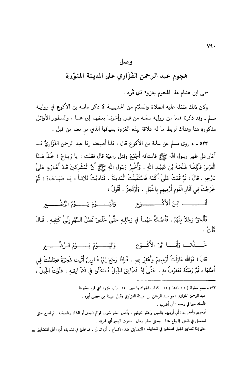 523 - * روى مسلم عن سلمة بن الأكوع قال: فلما أصبحنا إذا عبد الرحمن الفزاري قد أغار على ظهر رسول الله صلى الله عليه وسلم فاستاقه أجمع وقتل راعيه قال فقلت: يا رباح! خذ هذا الفرس فأبلغه طلحة بن عبيد الله. وأخبر رسول الله صلى الله عليه وسلم أن المشركين قد أغاروا على سرحه، قال: ثم قمت على أكمة فاستقبلت المدينة. فناديت ثلاثاً: يا صباحاه! ثم خرجت في آثار القوم أرميهم بالنبل. وأرتجز. أقول: