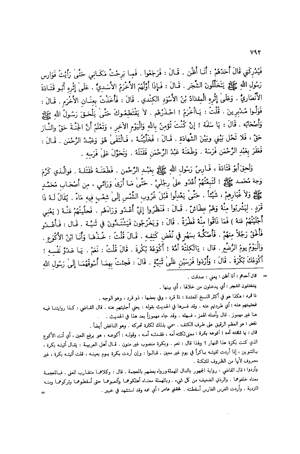 فيدركني قال أحدهم: أنا أظن. قال: فرجعوا. فما برحت مكاني حتى رأيت فوارس رسول الله صلى الله عليه وسلم يتخللون الشجر. قال: فإذا أولهم الأخرم الأسدي. على إثره أبو قتادة الأنصاري. وعلى إثره المقداد بن الأسود الكندي. قال: فأخذت بعنان الأخرم. قال: فولوا مدبرين. قلت: يا أخرم! احذرهم. لا يقتطعوك حتى يلحق رسول الله صلى الله عليه وسلم وأصحابه. قال: يا سلمة! إن كنت تؤمن بالله واليوم الآخر، وتعلم أن الجنة حق والنار حق، فلا تحل بيني وبين الشهادة. قال: فخليته، فالتقى هو وعبد الرحمن. قال: فعقر بعبد الرحمن فرسه. وطعنه عبد الرحمن فقتله. وتحول على فرسه.