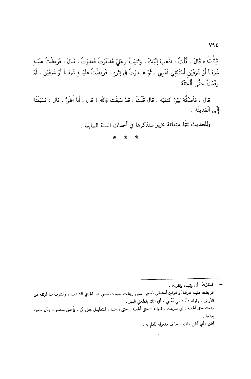 شئت" قال. قلت: اذهب إليك. وثنيت رجلي فظفرت فعدوت. قال: فربطت عليه شرفاً أو شرفين أستبقي نفسي. ثم عدوت في إثره. فربطت عليه شرفاً أو شرفين. ثم رفعت حتى ألحقه.