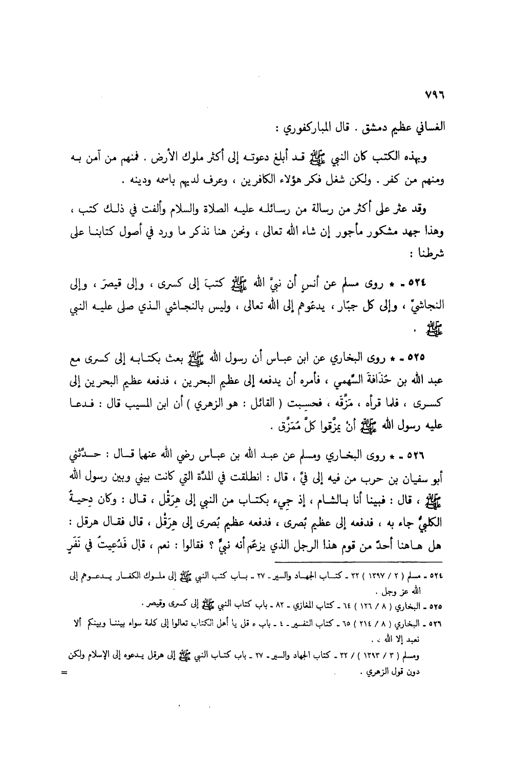 526 - * روى البخاري ومسلم عن عبد الله بن عباس رضي الله عنهما قال: حدثني أبو سفيان بن حرب من فيه إلى في، قال: انطلقت في المدة التي كانت بيني وبين رسول الله صلى الله عليه وسلم، قال: فبينا أنا بالشام، إذ جيء بكتاب من النبي إلى هرقل، قال: وكان دحية الكلبي جاء به، فدفعه إلى عظيم بصرى، فدفعه عظيم بصرى إلى هرقل، قال فقال هرقل: هل ها هنا أحد من قوم هذا الرجل الذي يزعم أنه نبي؟ فقالوا: نعم، قال فدعيت في نفر