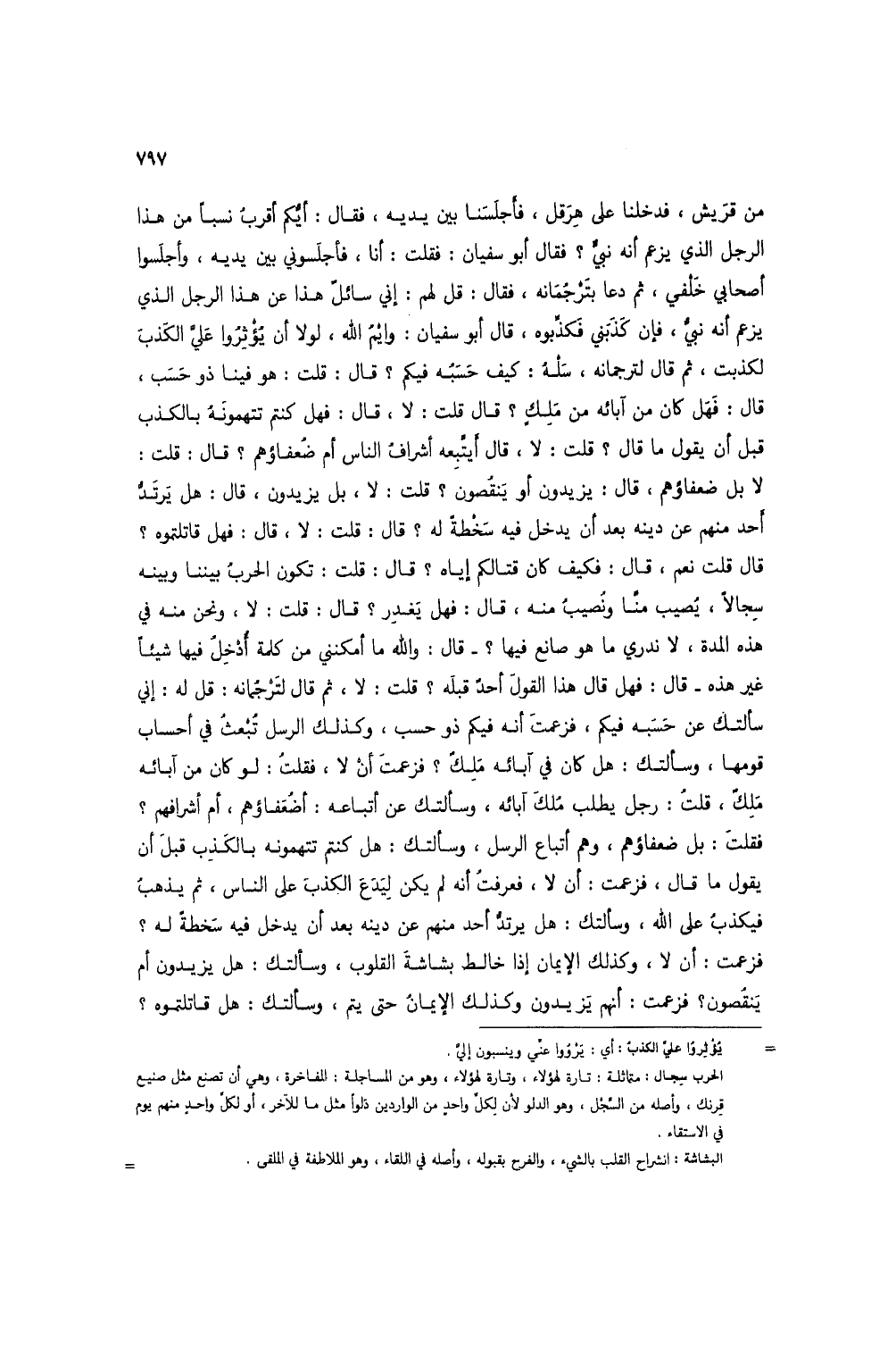 من قريش، فدخلنا على هرقل، فأجلسنا بين يديه، فقال: أيكم أقرب نسباً من هذا الرجل الذي يزعم أنه نبي؟ فقال أبو سفيان: فقلت: أنا، فأجلسوني بين يديه، وأجلسوا أصحابي خلفي، ثم دعا بترجمانه، فقال: قل لهم: إني سائل هذا عن هذا الرجل الذي يزعم أنه نبي، فإن كذبني فكذبوه، قال أبو سفيان: وايم الله، لولا أن يؤثروا علي الكذب لكذبت، ثم قال لترجمانه، سله: كيف حسبه فيكم؟ قال: قلت: هو فينا ذو حسب، قال: فهل كان من آبائه من ملك؟ قال قلت: لا، قال: فهل كنتم تتهمونه بالكذب قبل أن يقول ما قال؟ قلت: لا، قال أيتبعه أشراف الناس أم ضعفاؤهم؟ قال: قلت: لا بل ضعفاؤهم، قال: يزيدون أو ينقصون؟ قلت: لا، بل يزيدون، قال: هل يرتد أحد منهم عن دينه بعد أن يدخل فيه سخطة له؟ قال: قلت: لا، قال: فهل قاتلتموه؟ قال قلت نعم، قال: فكيف كان قتالكم إياه؟ قال: قلت: تكون الحرب بيننا وبينه سجالاً، يصيب منا ونصيب منه، قال: فهل يغدر؟ قال: قلت: لا، ونحن منه في هذه المدة، لا ندري ما هو صانع فيها؟ - قال: والله ما أمكنني من كلمة أدخل فيها شيئاً غير هذه - قال: فهل قال هذا القول أحد قبله؟ قلت: لا، ثم قال لترجمانه: قل له: إني سألتك عن حسبه فيكم، فزعمت أنه فيكم ذو حسب، وكذلك الرسل تبعث في أحساب قومها، وسألتك: هل كان في آبائه ملك؟ فزعمت أن لا، فقلت: لو كان من آبائه ملك، قلت: رجل يطلب ملك آبائه، وسألتك عن أتباعه: أضعفاؤهم، أم أشرافهم؟ فقلت: بل ضعفاؤهم، وهم أتباع الرسل، وسألتك: هل كنتم تتهمونه بالكذب قبل أن يقول ما قال: فزعمت: أن لا، فعرفت أنه لم يكن ليدع الكذب على الناس، ثم يذهب فيكذب على الله، وسألتك: هل يرتد أحد منهم عن دينه بعد أن يدخل فيه سخطة له؟ فزعمت: أن لا، وكذلك الإيمان إذا خالط بشاشة القلوب، وسألتك: هل يزيدون أم ينقصون؟ فزعمت: أنهم يزيدون وكذلك الإيمان حتى يتم، وسألتك: هل قاتلتموه؟