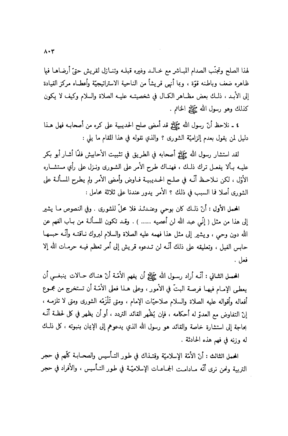 لقد استشار رسول الله صلى الله عليه وسلم أصحابه في الطريق في تثبيت الأحابيش فلما أشار أبو بكر عليه بألا يفعل ترك ذلك، فهناك طرح الأمر على الشورى ونزل على رأي مستشاره الأول، لكن نلاحظ أنه في صلح الحديبية فاوض وأمضى الأمر ولم يطرح المسألة على الشورى أصلاً فما السبب في ذلك؟ الأمر يدور عندنا على ثلاثة محامل: