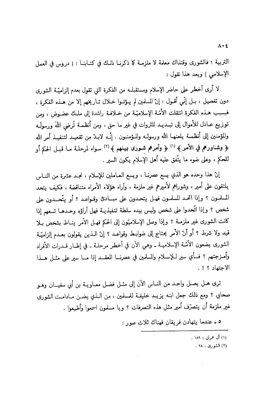 إن هذا وحده هو الذي يسع عصرنا، ويسع العاملين للإسلام، نجد عشرة من الناس يلتقون على أمير، وشوراهم لأميرهم غير ملزمة، وآراء هؤلاء الأمراء متناقضة، فكيف يتحد المسلمون؟ وإذا اتحد المسلمون فهل يتحدون على مبادئ وقواعد؟ أو يتحدون على شخص؟ وإذا اتحدوا على شخص وليس بيده سلطة تنفيذية فهل آراؤه وحدها تسعهم إذا كانت الشورى غير ملزمة؟ وإذا وصل الإسلاميون إلى الحكم فهل الأمر يناط بشخص بلا قيد ولا شرط؟ أو أن الأمر يحتاج إلى ضوابط وقواعد؟ إن الذين يقولون بعدم إلزامية الشورى يضعون الأمة الإسلامية - وهي الآن في أخطر مرحلة - في إطار قدرات الأفراد وأمزجتهم؟ فأي سير للإسلام والمسلمين في عصرنا المعقد إذا ما سير على مثل هذا الاجتهاد؟!.