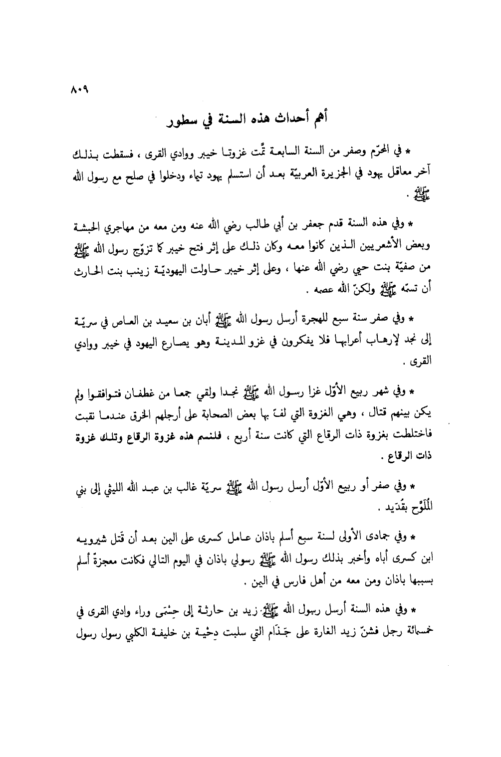 * وفي هذه السنة قدم جعفر بن أبي طالب رضي الله عنه ومن معه من مهاجري الحبشة وبعض الأشعريين الذين كانوا معه وكان ذلك على إثر فتح خيبر كما تزوج رسول الله صلى الله عليه وسلم من صفية بنت حيي رضي الله عنها، وعلى إثر خيبر حاولت اليهودية زينب بنت الحارث أن تسمه صلى الله عليه وسلم ولكن الله عصمه.