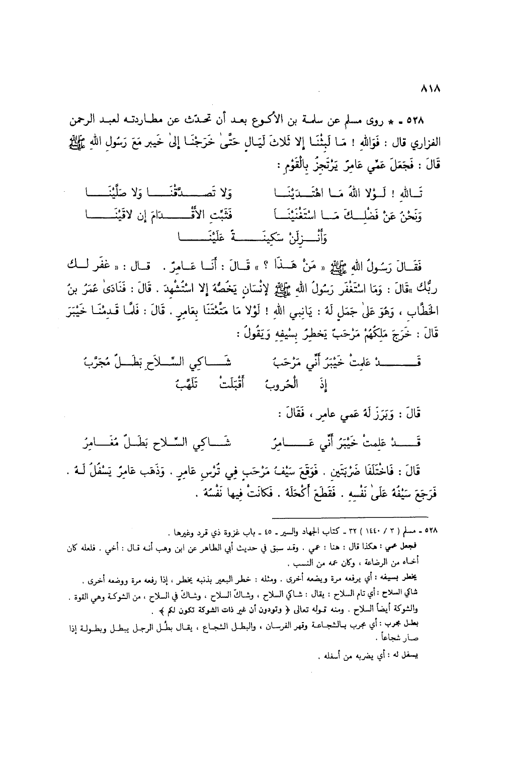 528 - * روى مسلم عن سلمة بن الأكوع بعد أن تحدث عن مطاردته لعبد الرحمن الفزاري قال: فوالله! ما لبثنا إلا ثلاث ليال حتى خرجنا إلى خيبر مع رسول الله صلى الله عليه وسلم قال: فجعل عمي عامر يرتجز بالقوم: